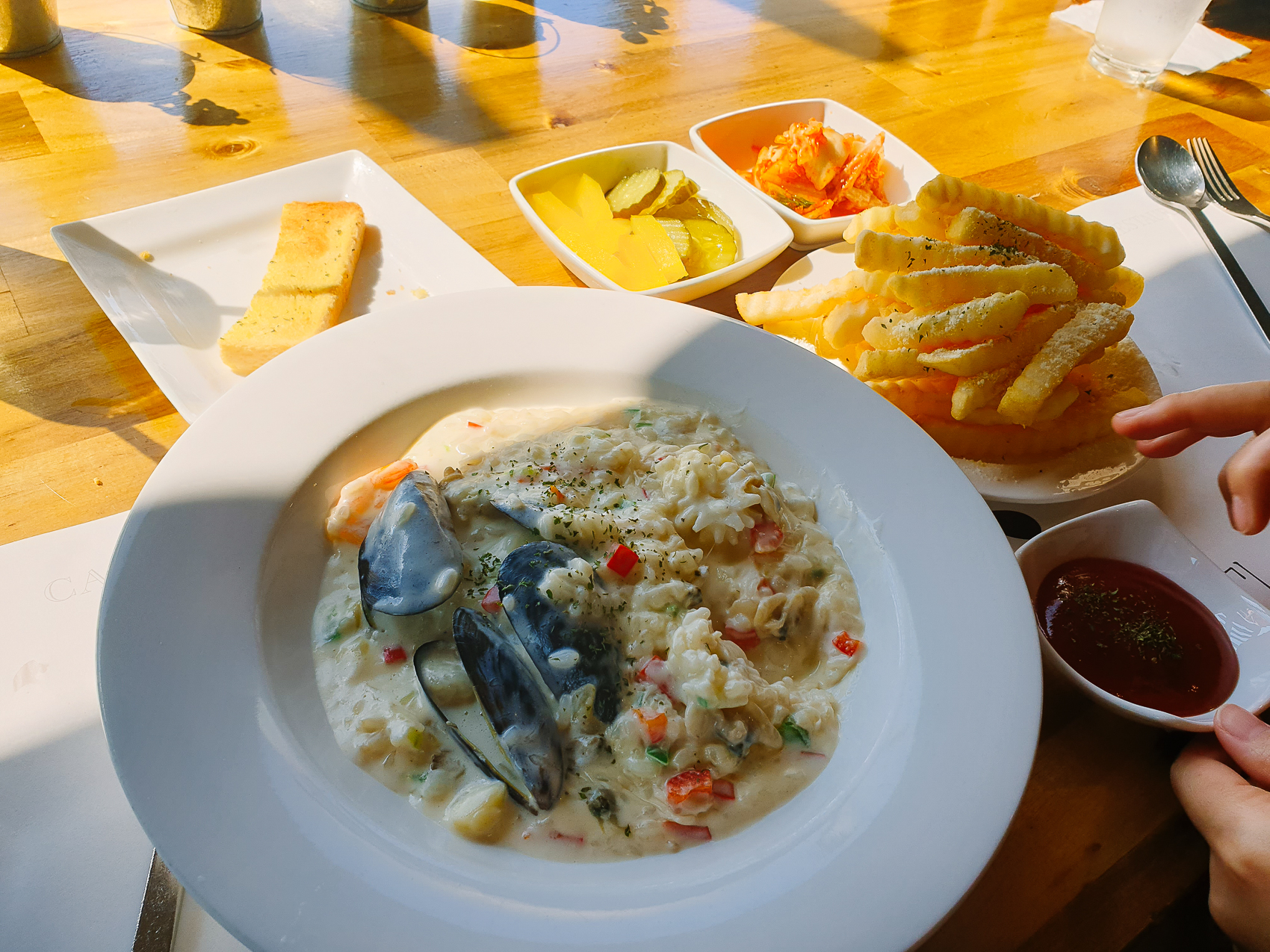 당연히 아내는 아직 소화도 되지 않은상태여서 일단 크림해물리조또(15,000원), 프렌치프라이(5,000원), 식후청포도에이드(3,000원)을 주문했다. 우유빛깔로 윤기가 좔좔 흐르는 크림해물 리소토. 굉장히 먹음직스러운 모습이다!
