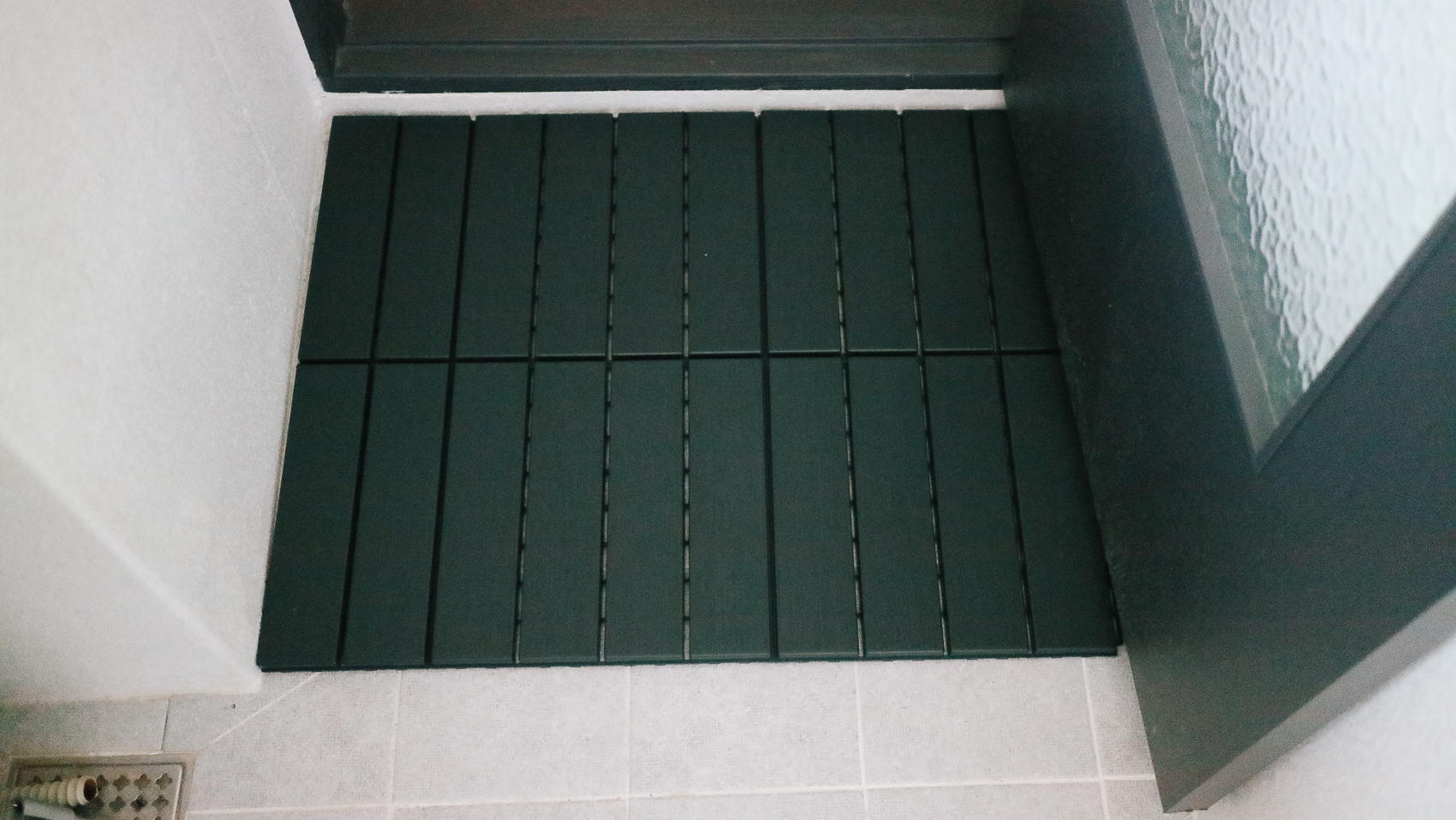 짜잔! 베란다 슬리퍼가 걸리는 라인만 베란다 타일 조립식 프리미엄 바닥재를 설치한 모습이다. 저 바깥에 슬리퍼를 벗고 들어오면 문에 걸림을 의식하지 않고 베란다 문을 편하게 여닫을 수 있다.
