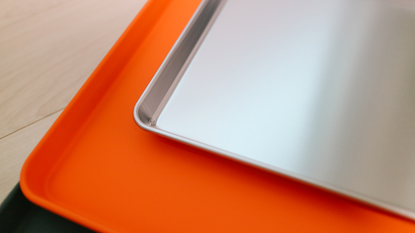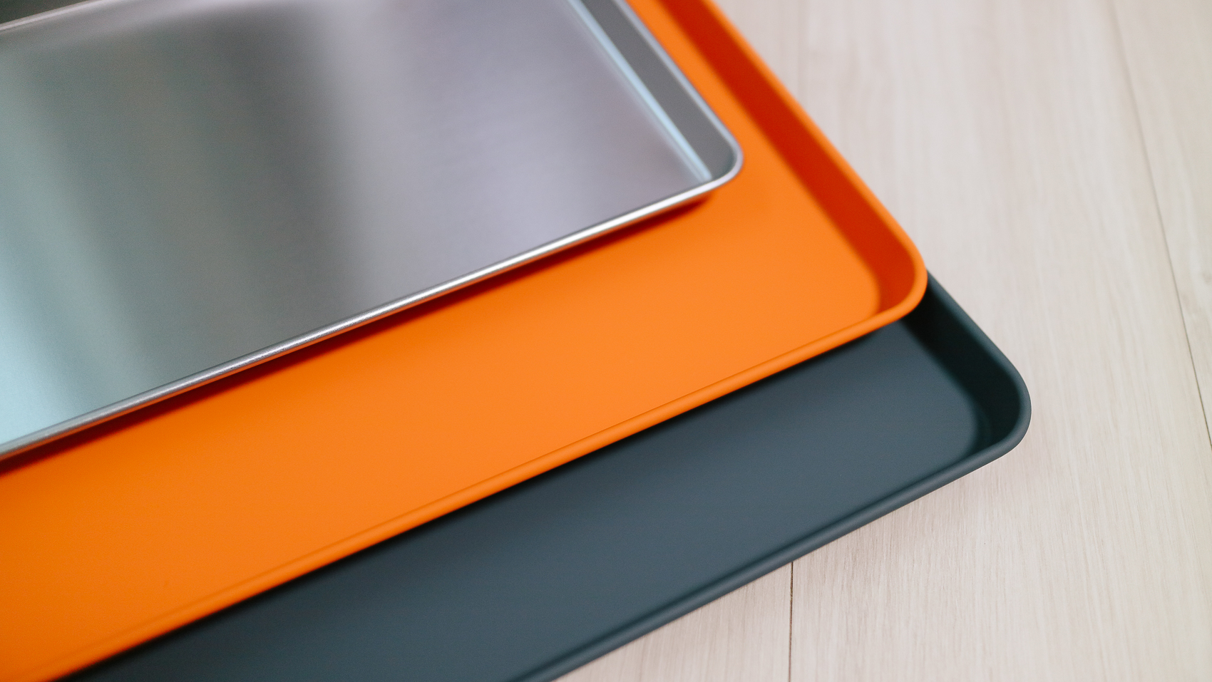 이왕 주문하는거 논슬립 메탈 쟁반을 주문했다. 맨 위에 있는 것은 논슬립이 아닌 그냥 메탈 장난이다. 식기의 물받이로 사용하려고 주문한 것이고 그 아래 다크 그레이, 오렌지 쟁반이 논슬립 메탈 쟁반이다.