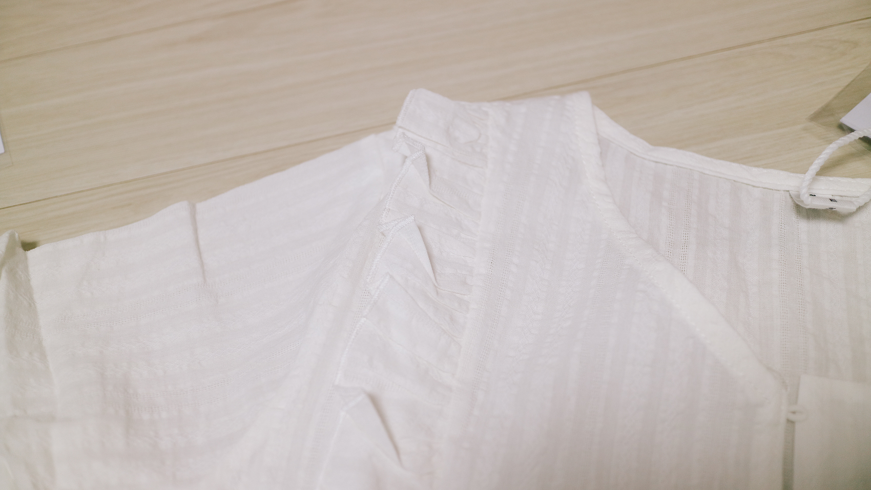 다소 단조로울 수 있는 화이트 원피스 잠옷에 주름과 가장자리 마감, 장식을 통하여 낭랑하면서 포근한 감성을 더해준