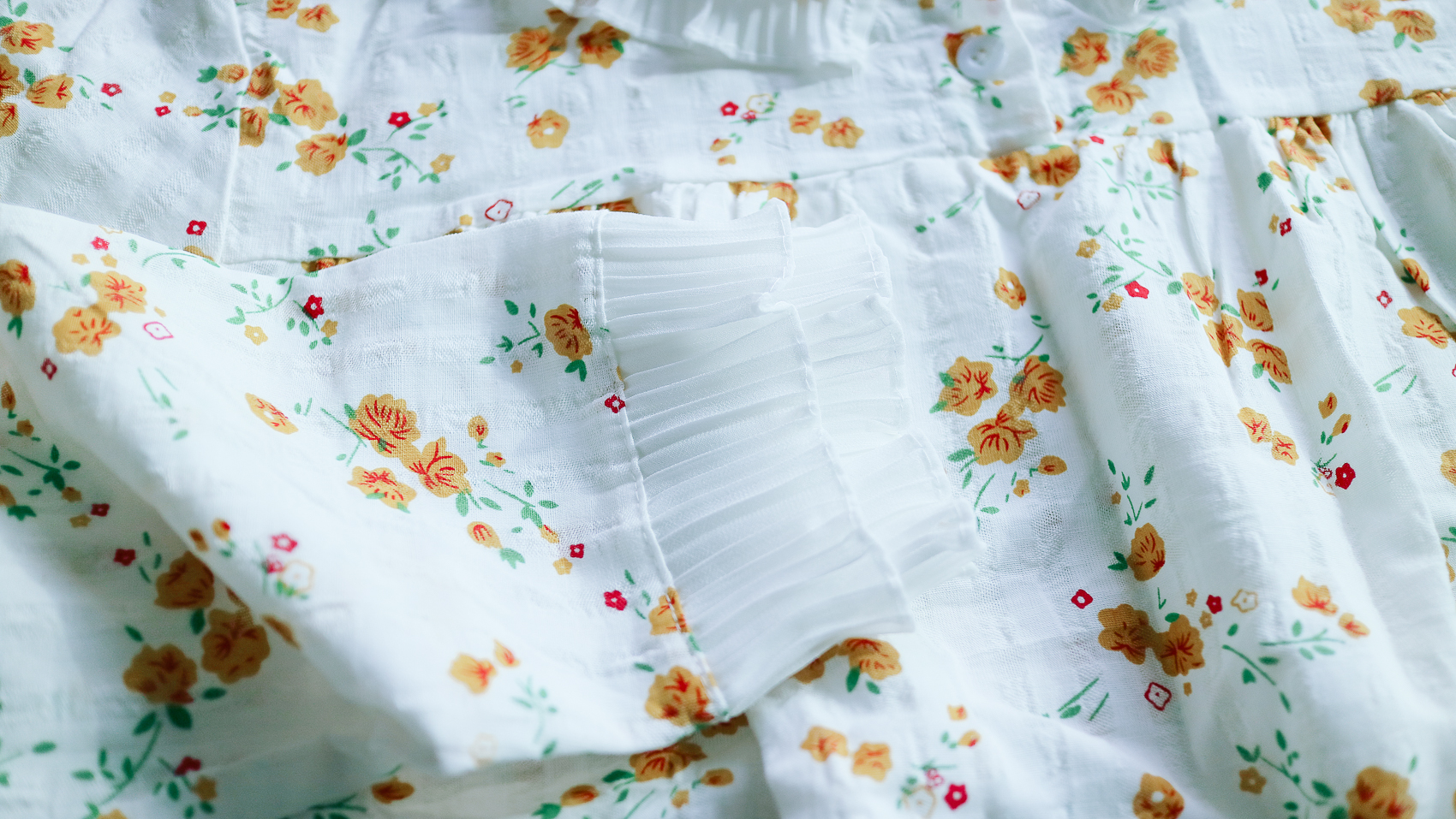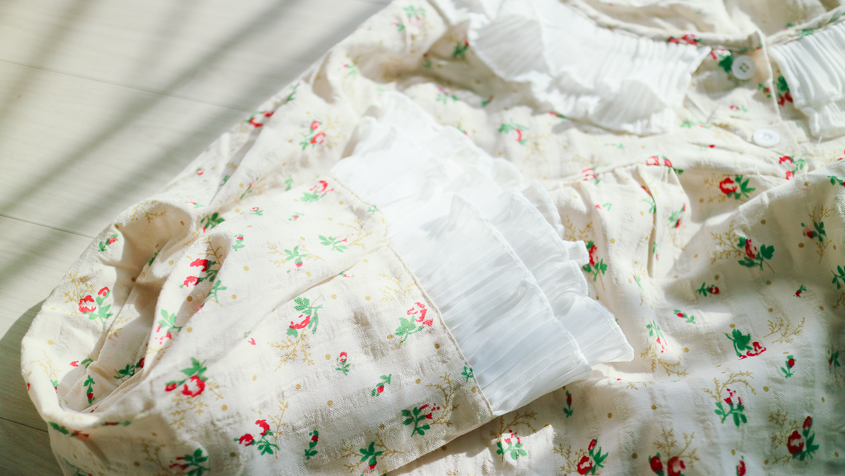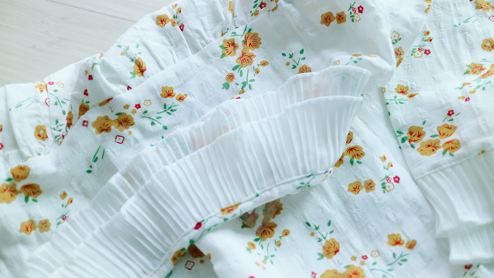 손목과 넥 라인에는 *프릴로 마감되어 있어서 전체적인 귀여운 꽃무니 패턴에 샤랄라 한 러블리를 더했다고 할 수 있다.