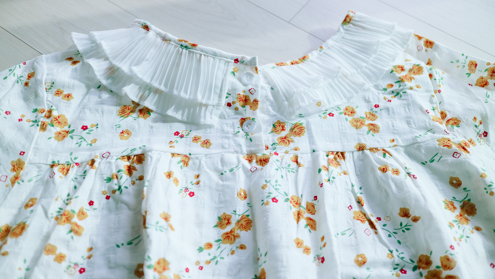 마감도 전체적으로 나쁘지 않고, 꽃무늬 패턴과 프릴 장식이 꽤나 잘 어우러지는 모습이다. 아직 임신 중기라 배가 많이 나오지 않았지만 만삭이 되어도 체형이 작은 아내에게는 더할 나위 없이 편한 원피스 잠옷 홈웨어라고 할 수 있다.