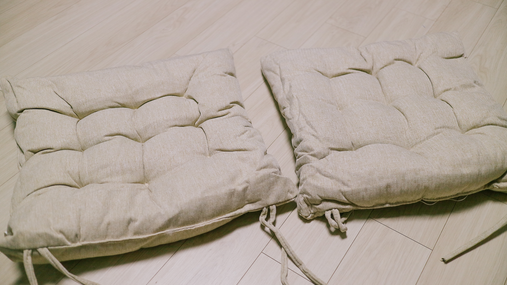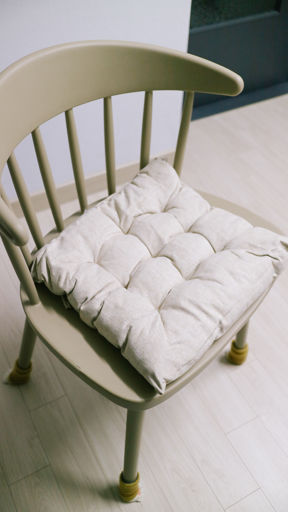 식탁 의자에 고정끈을 묶어서 설치한 모습. 사진으로 봐도 굉장히 도톰한 쿠션감이 느껴진다. 그만큼 편안한 착석감을 주면서 감성적인 인테리어 연출도 가능한 비스토어 베이직 노르딕 방석이라고 할 수 있다.