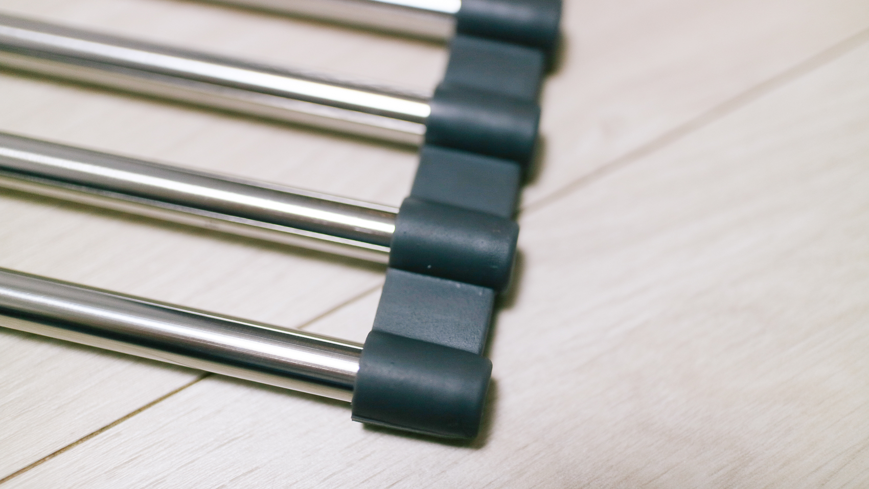 제품을 미사용시 김밥처럼 말아서 보관할 수 있으며, 싱크대 거치되는 좌우 부분에는 논슬립 고무패킹으로 마감되어 있어 미끄럼을 최소화해준다.