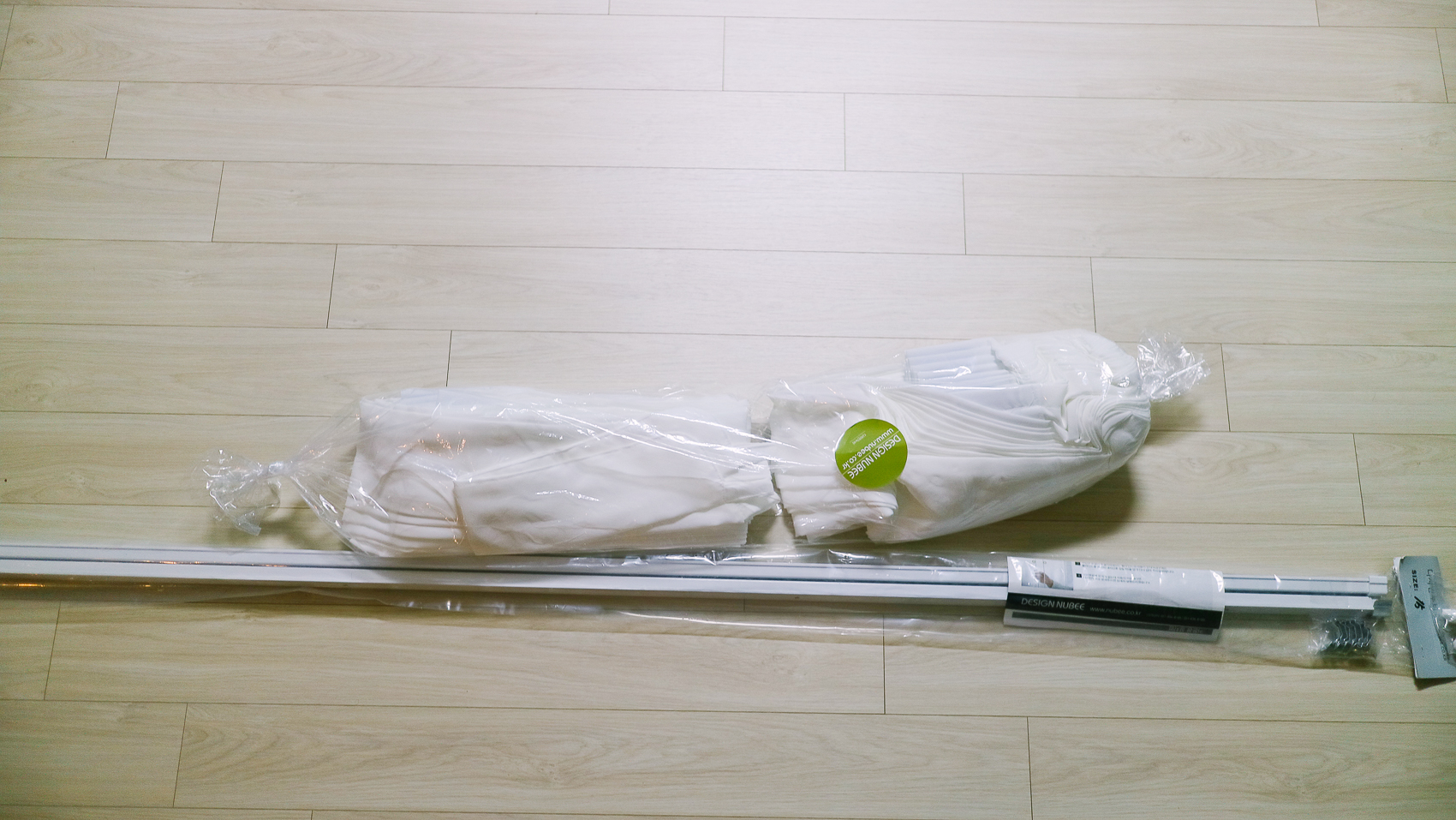 제품 구성품은 추가 주문한 화이트 레일, 커튼이 있다. 커튼은 당연히 좌우 1장씩 해서 총 2장으로 주문을 하였고, 깔끔하게 제작되어 핀까지 끼어진 상태로 안전하게 배송되었다.