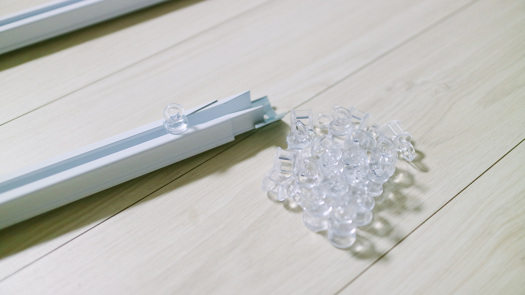 커튼에 꽂혀있는 핀 수량을 파악한 뒤 화이트 레일에 걸려있는 고정핀을 빼준다. 그렇지 않으면 여분의 고정핀이 차지하는 공간만큼 커튼이 닫히지 않는다.
