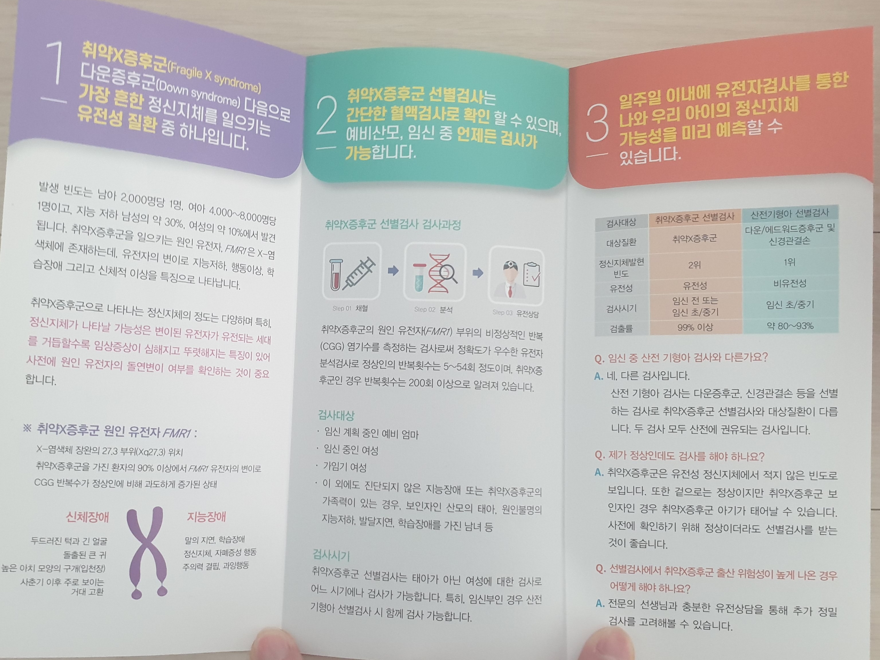 혈액 검사이며, 검사대상은 임신 전 또는 초·중기(9-20주 권장), 취약 X 증후군에 대한 가족력