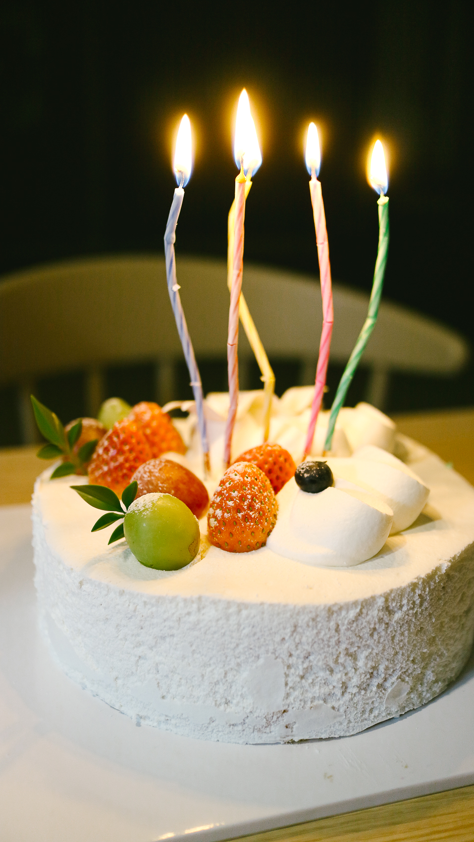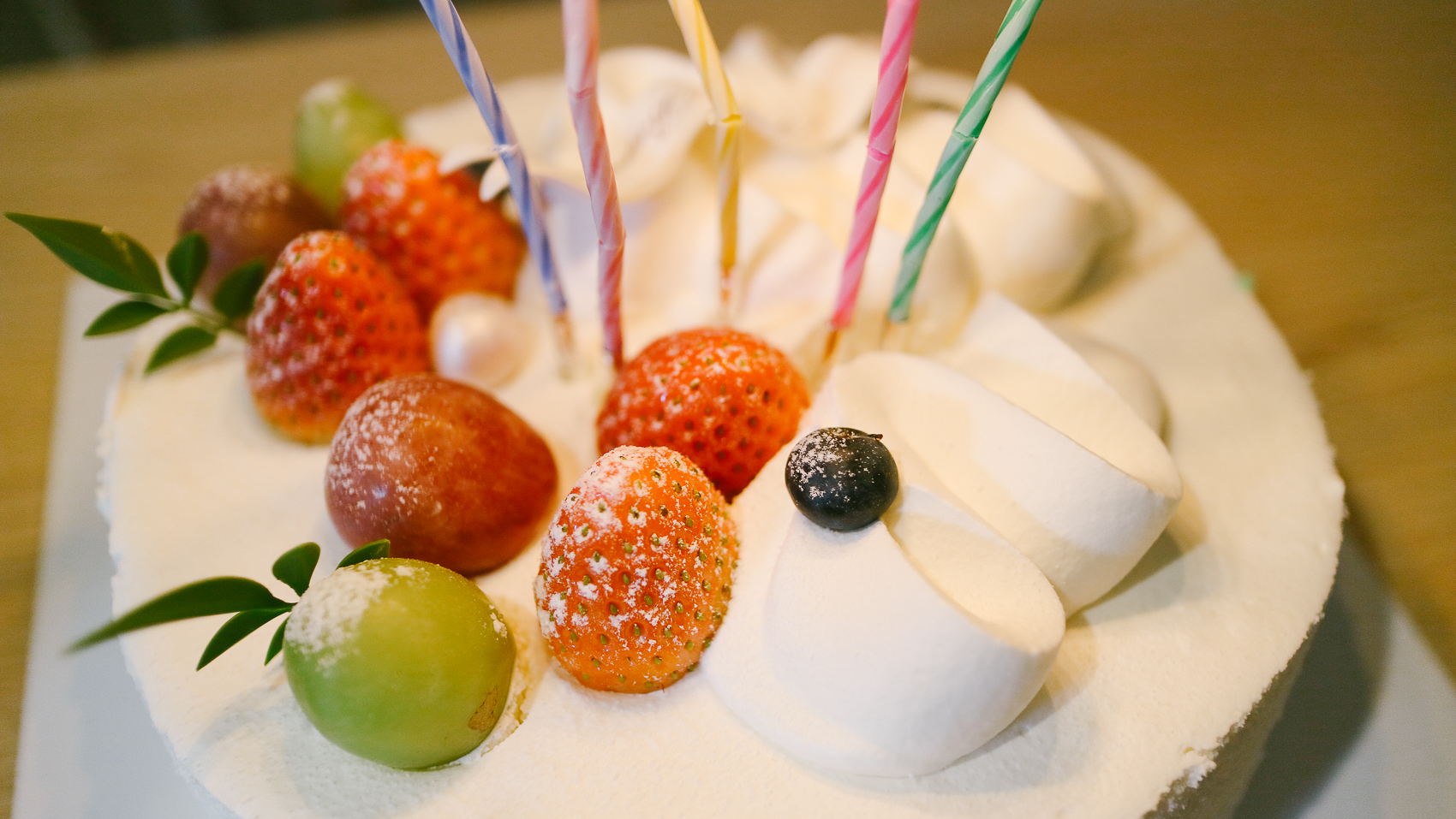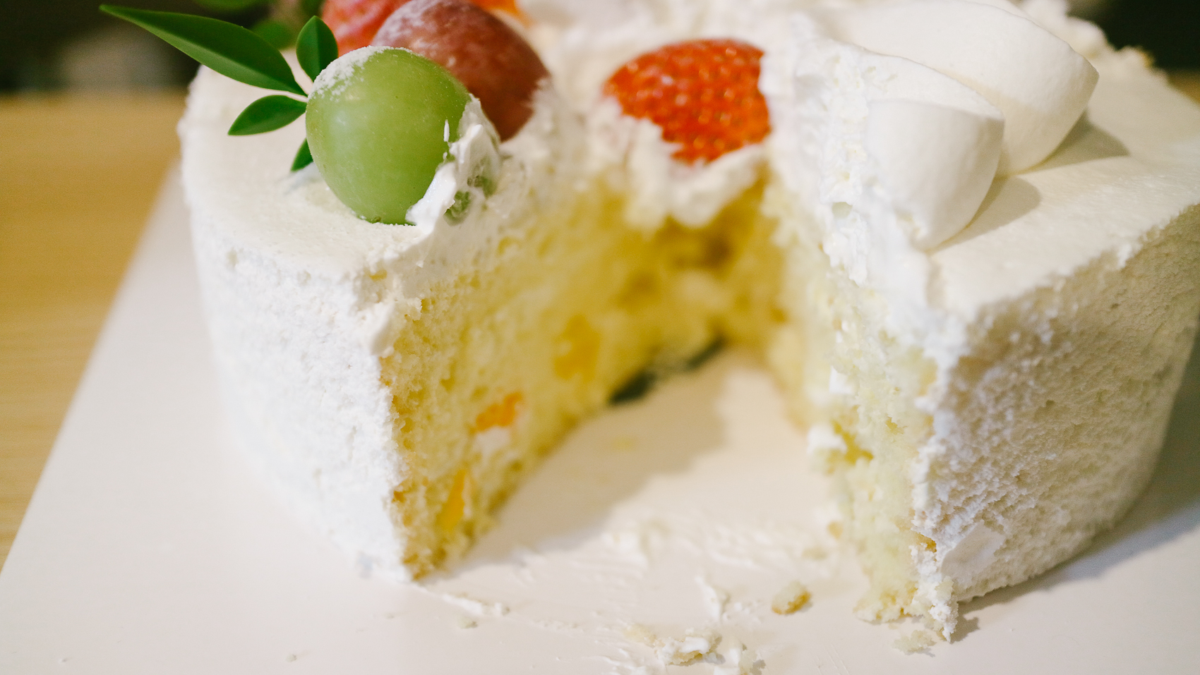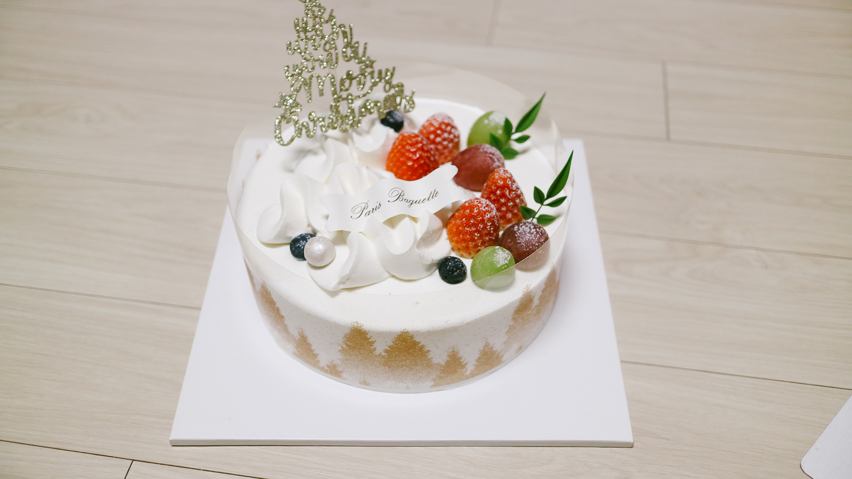 개봉한 모습은 크리스마스 레터링 트리와 새하얀 설경이 연상되는 생크림 베이스에 딸기와 포도가 있다. 자세히 보면 측면에 케이크 보호필름도 트리가 예쁘게 그려져 있는 모습이다.