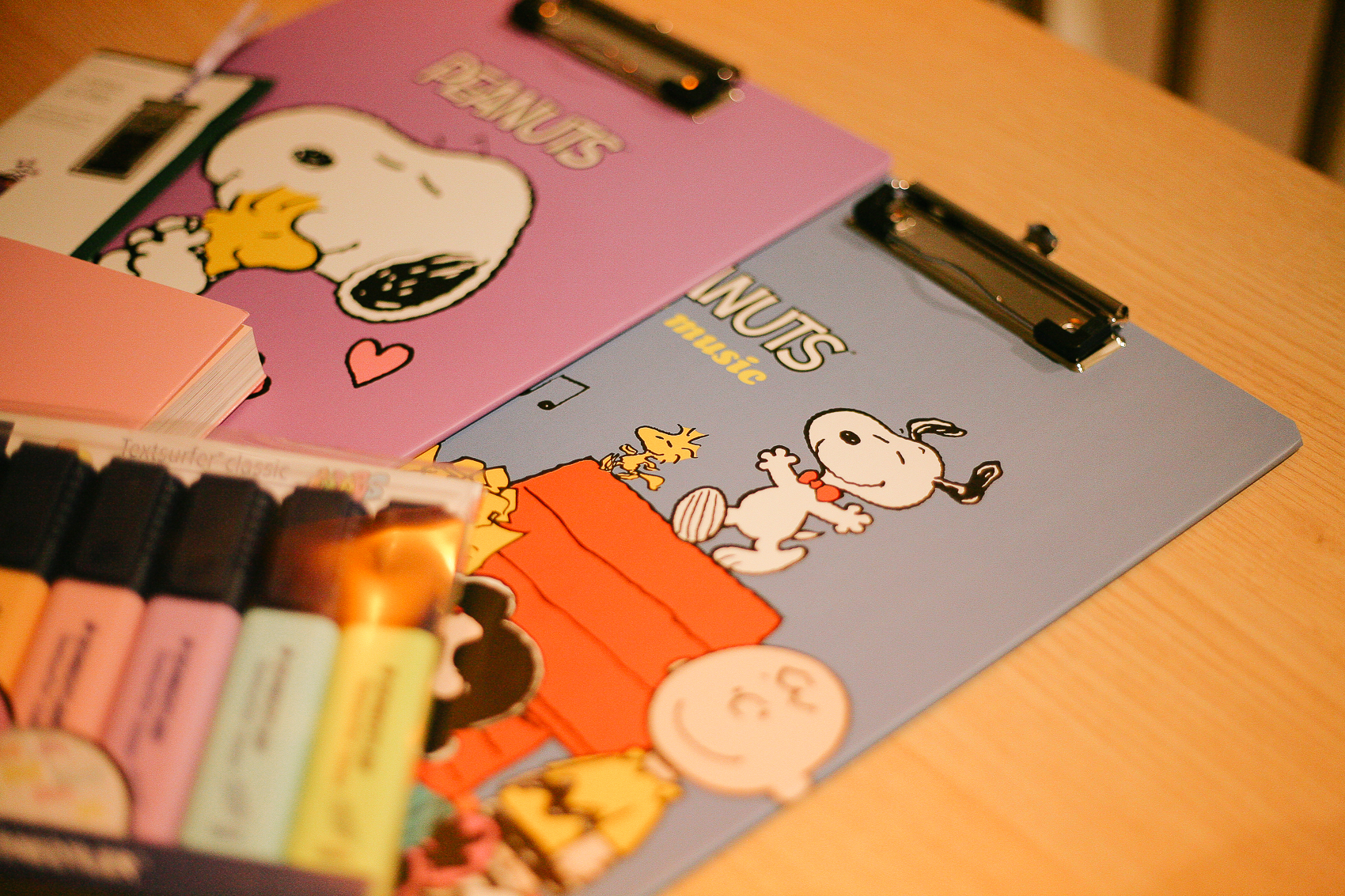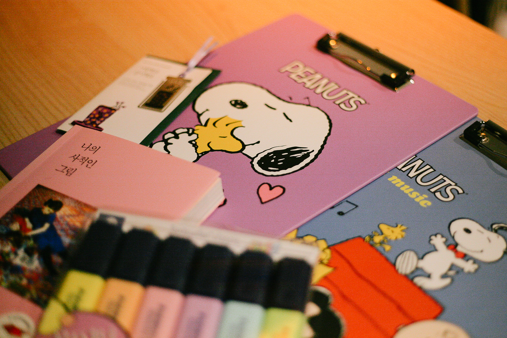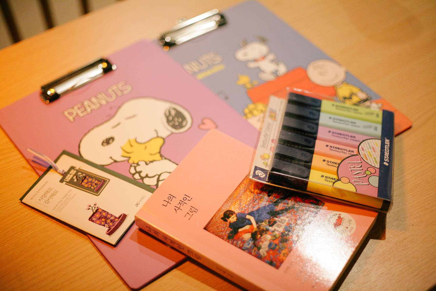 아내가 저번에 구매한 귀여운 형광펜, 책, 스누피 클립보드. 내가 주로 사용하는 것은 아니지만 아내는 가끔 이렇게 아기자기하고 귀여운 소품이나 학용품 같은 것을 구매하곤 한다.