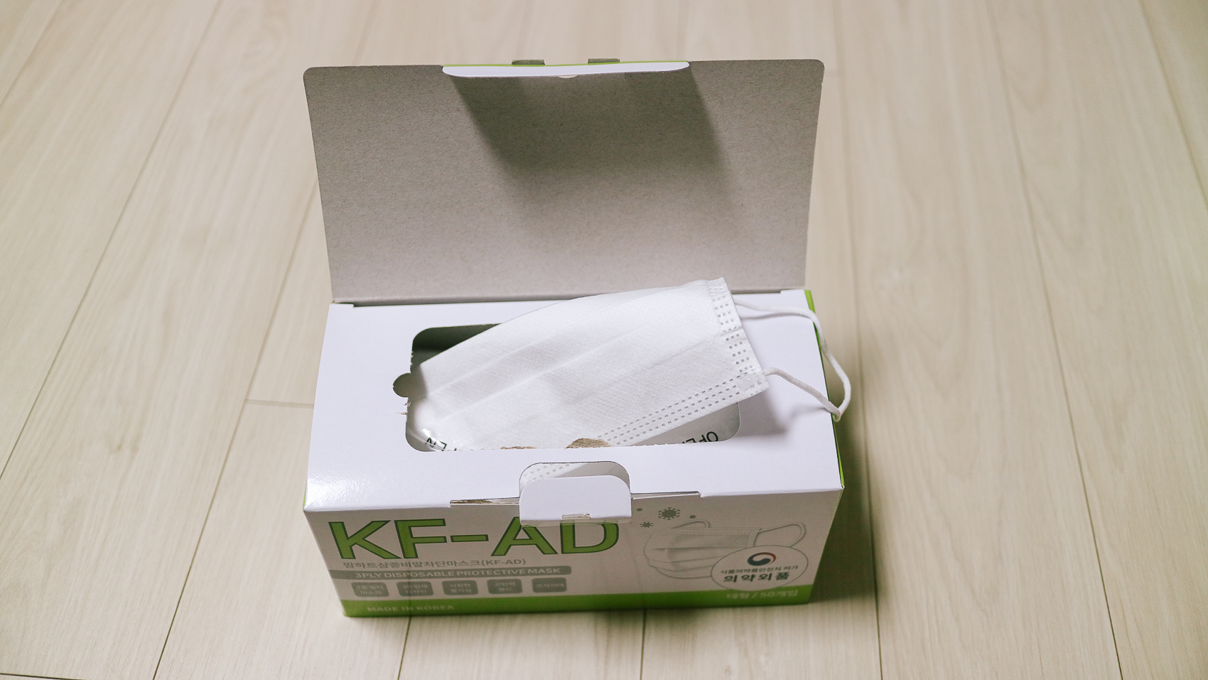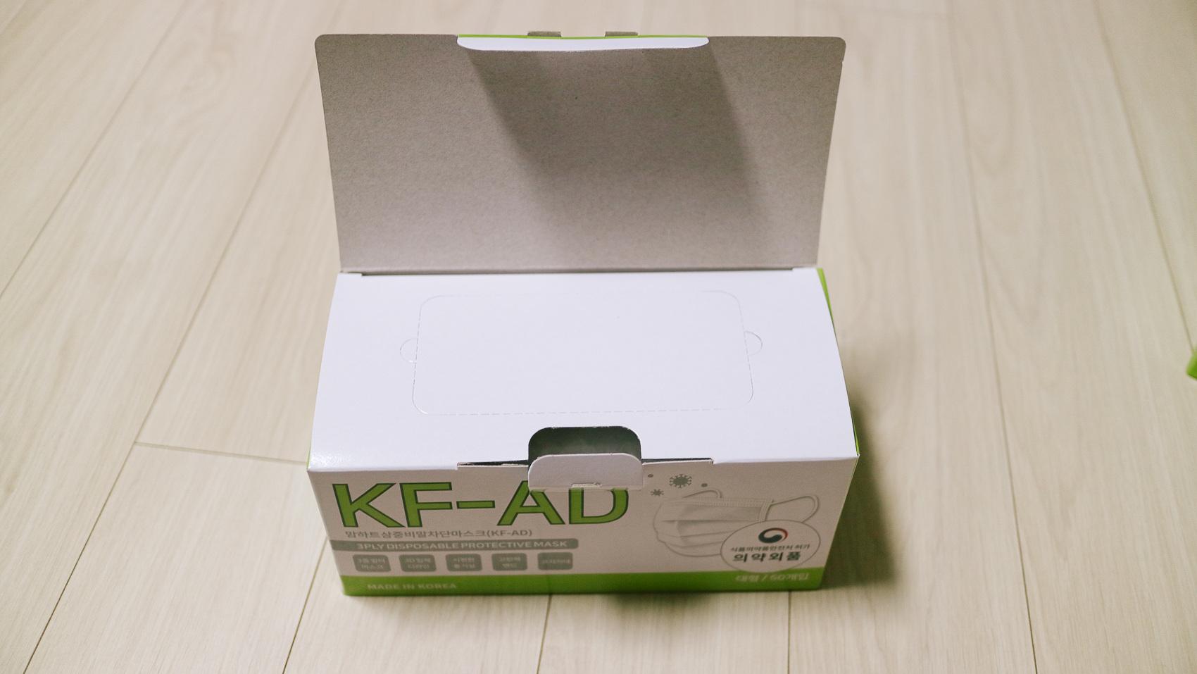 1박스당 50매가 들어있고 가격도 착해서 한 번에 여러 개를 구매하였다. MB최고급 원단 및 공기 중 비말 차단과 3중 필터로 호흡이 편안 KF-AD 비말 차단 마스크! 무엇보다 국내 생산으로 식약처 인증까지 받은 제품이라 믿고 사용할 수 있다.