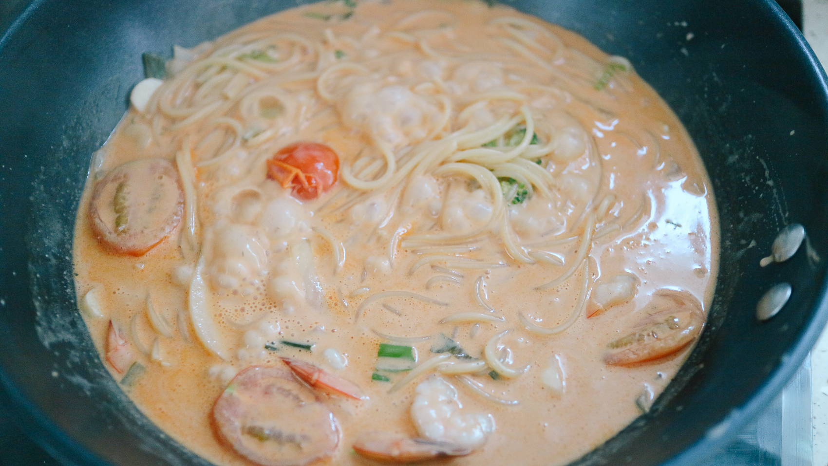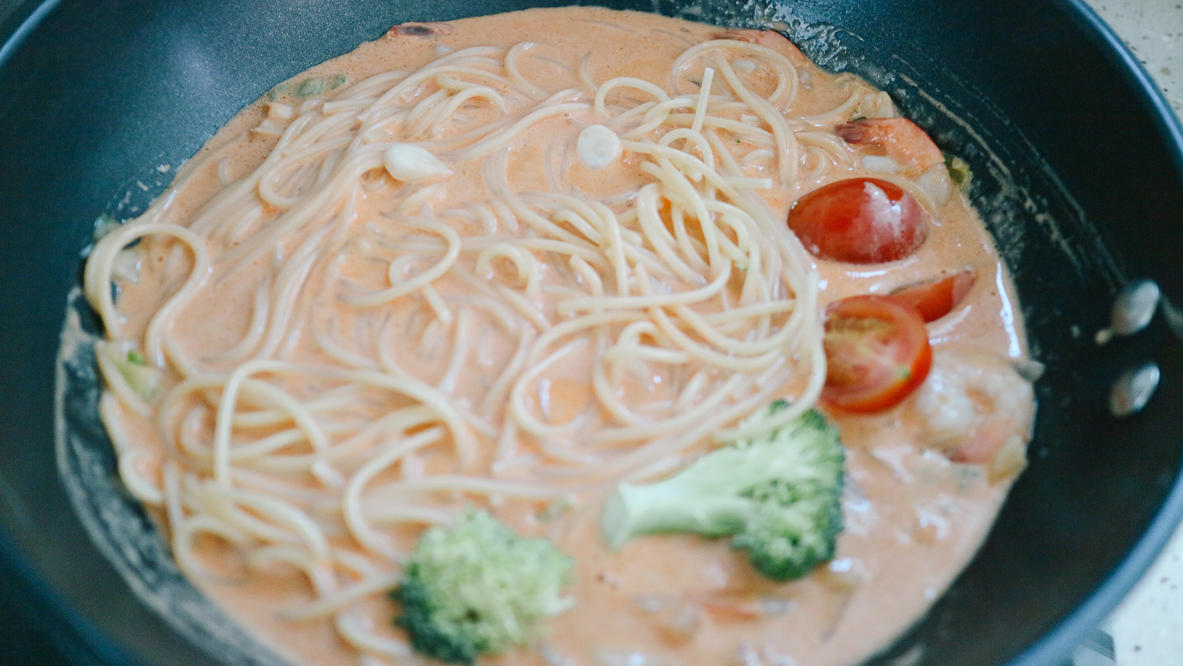 보글보글~ 처음에 비스크 소스를 전부 넣었던 나는 많은 양 때문에 꽤나 오랜시간 더 끓여서 살짝 소스를 졸였다. 그래도 다행히 파스타면은 불거나 하지 않고 적절하게 잘 익었다.