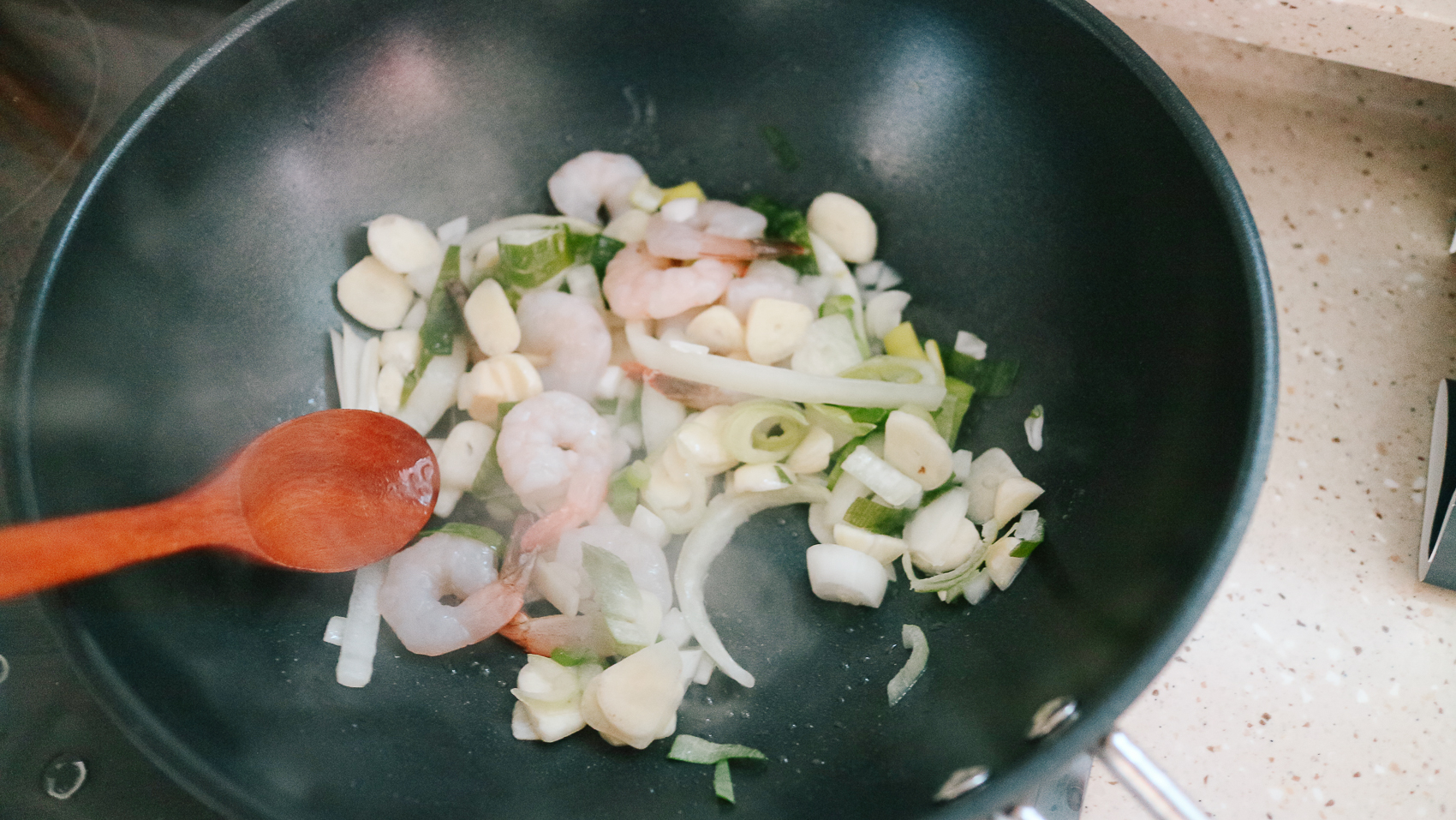 그동안 예열한 프라이팬에 올리브유를 두른 후 손질한 야채를 넣어 강불에 약 30초간 볶아주고, 새우를 추가로 투입한 후 30초 더 볶아준다.