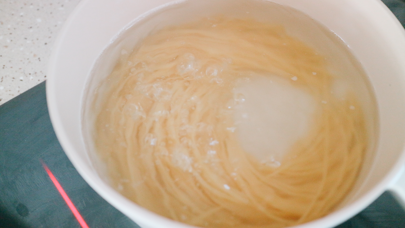 냄비에 물을 넣고 끓어오르면 파스타면을 넣고 6-7분간 저어가며 삶은 후 채반에 건져내기