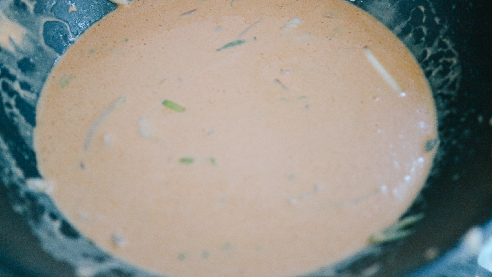 3. 같은 팬에 비스크 소스를 넣고 가장자리에 끓어오를 때까지 중불에서 약 2-3분 끓이기
