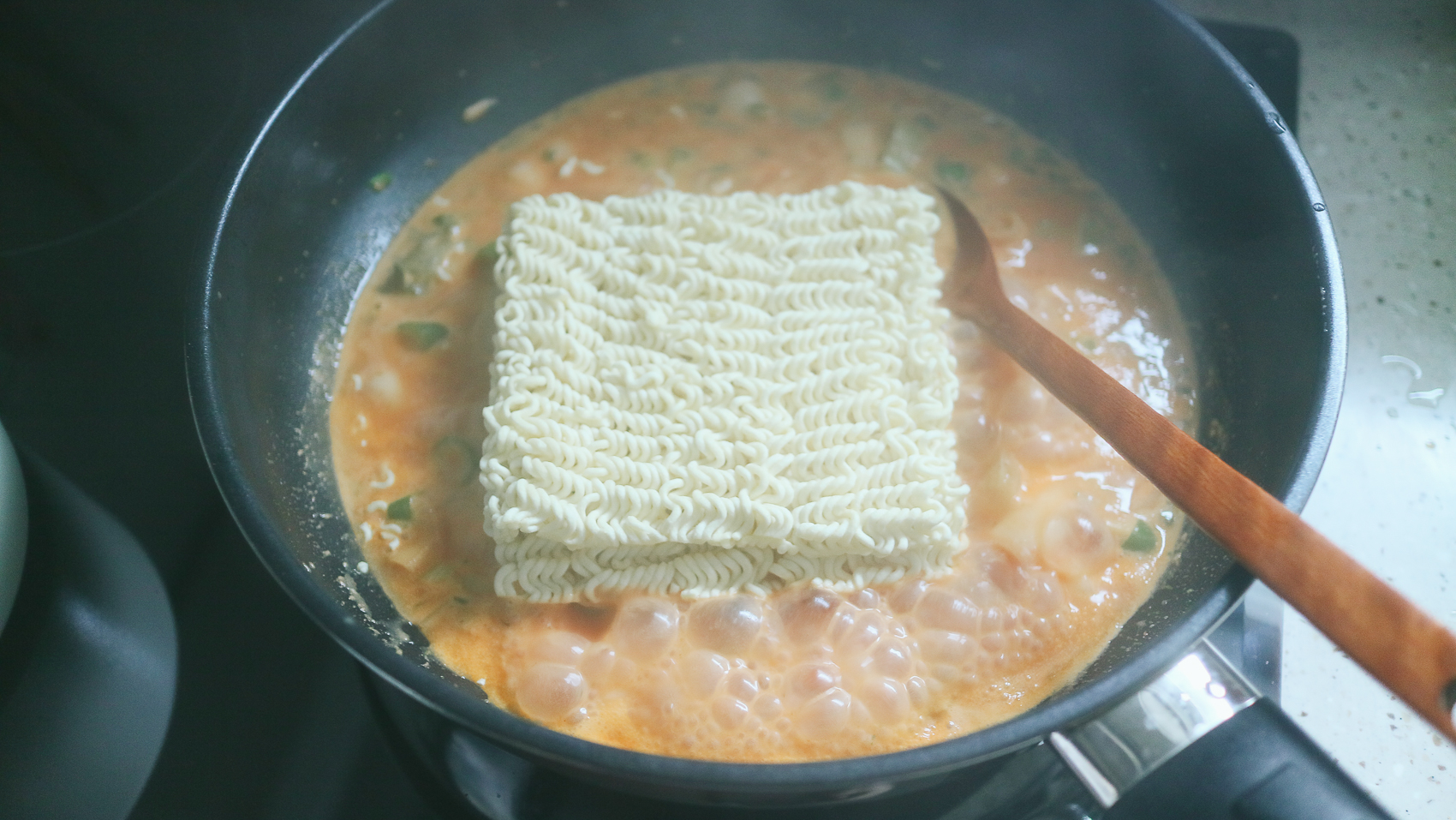 수프 가루에서부터 이미 로제의 향이 가득했다. 물을 조금 많이 넣은 것 같아서 라면 면발도 함께 넣어 보았다. 면발을 조금 익힌 뒤 넣었어야 하는데, 바로 넣어서 물을 죄다 흡수해버리는 참사를 겪었다.