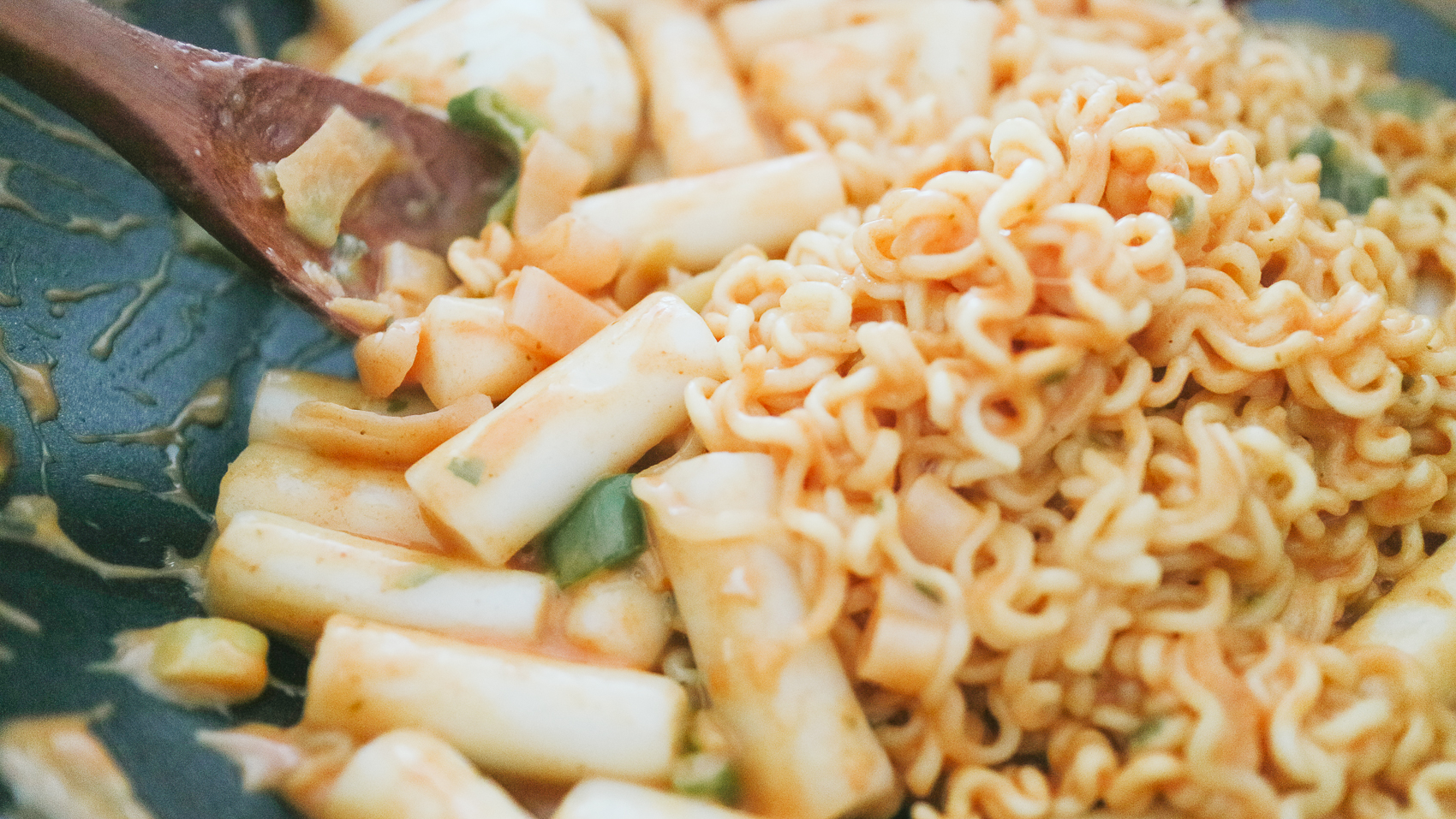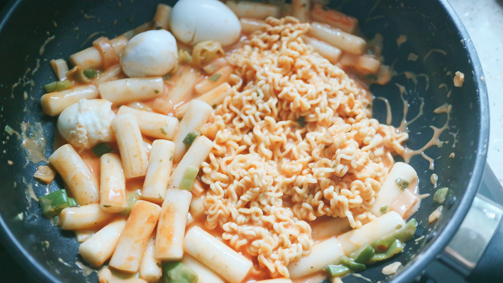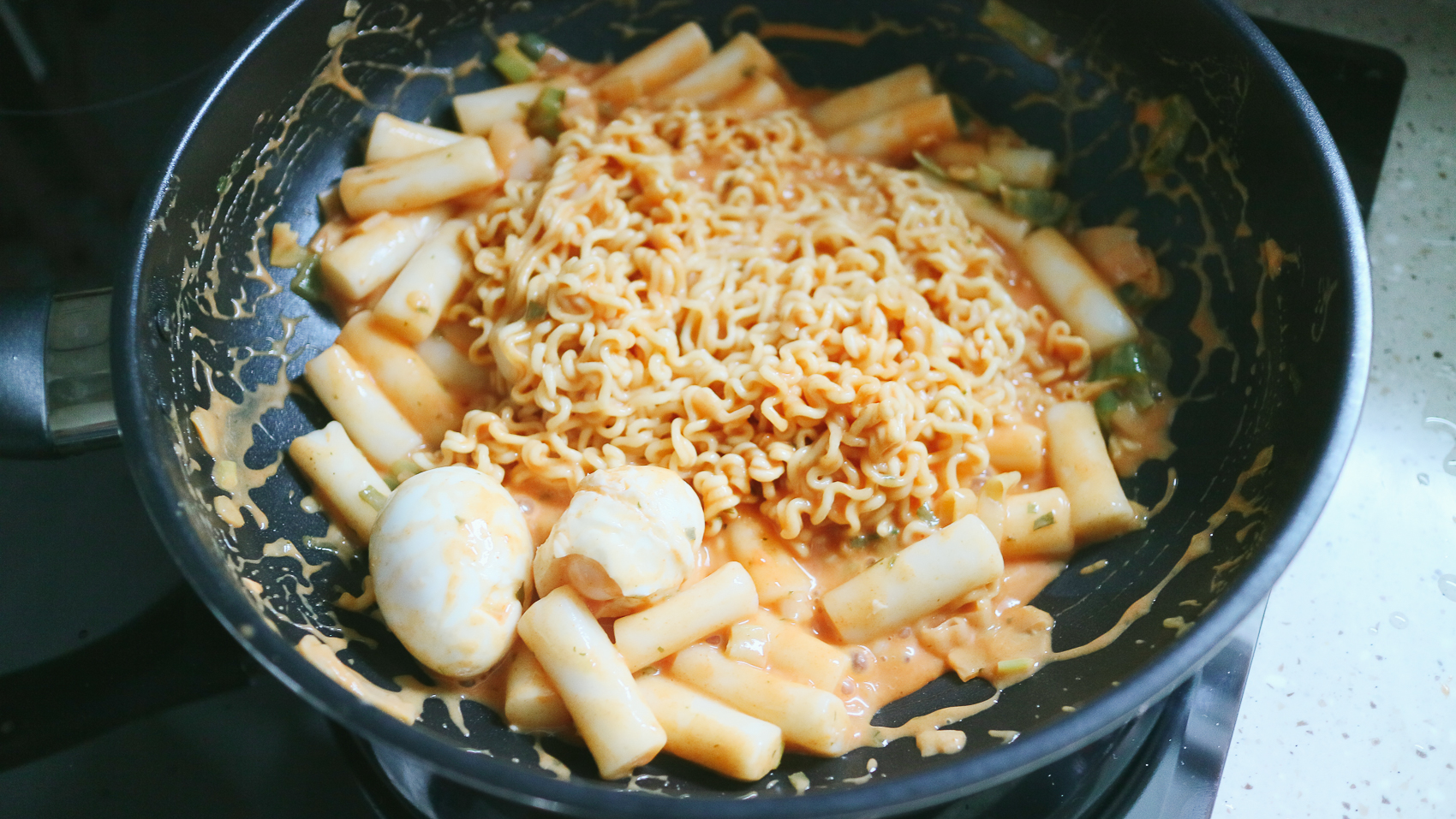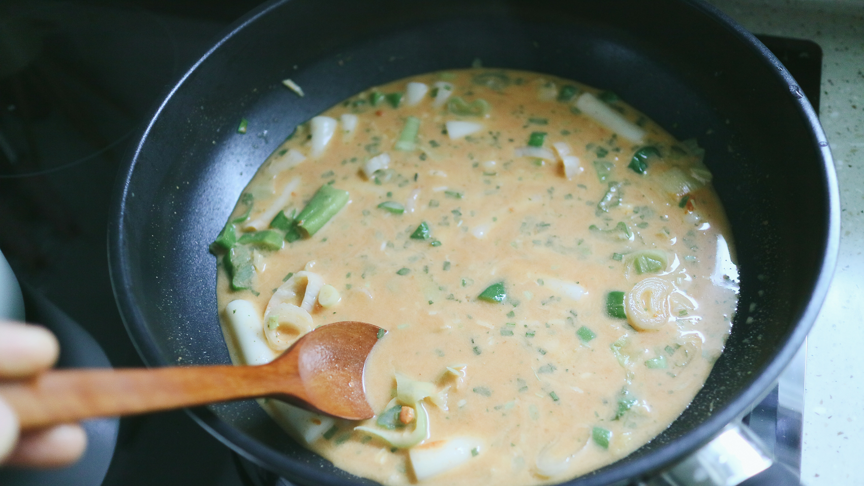②팬에 물 200ml와 로제스프, 건더기, 떡볶이 떡을 한 번에 넣고 떡볶이 떡이 부드러워질 때까지 4-5분간 저어가며 조리한다.