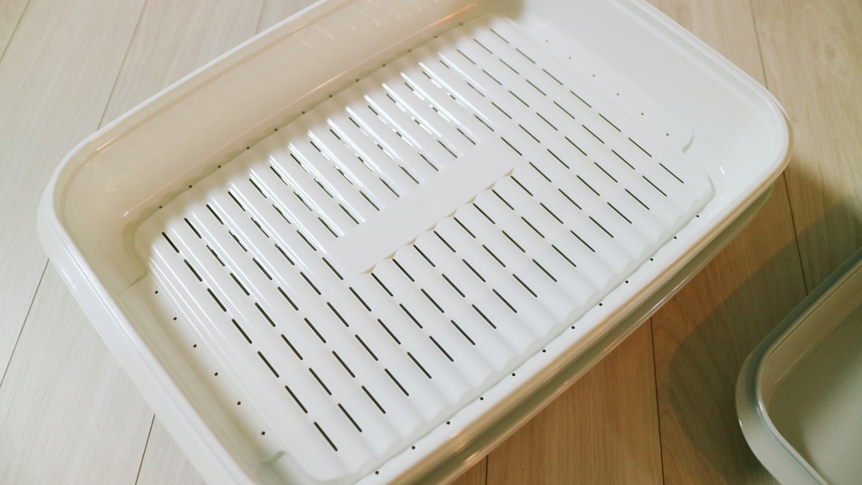 제품은 2개 채반용기가 있는데, 1개 채반 용기에 뚜껑과 채반, 바디가 있다. 쟁반 겸용으로 사용할 수 있는 뚜껑과 물기나 기름 받칠 때 좋은 채반이 구성되어 있는 보관용기가 특징이다.