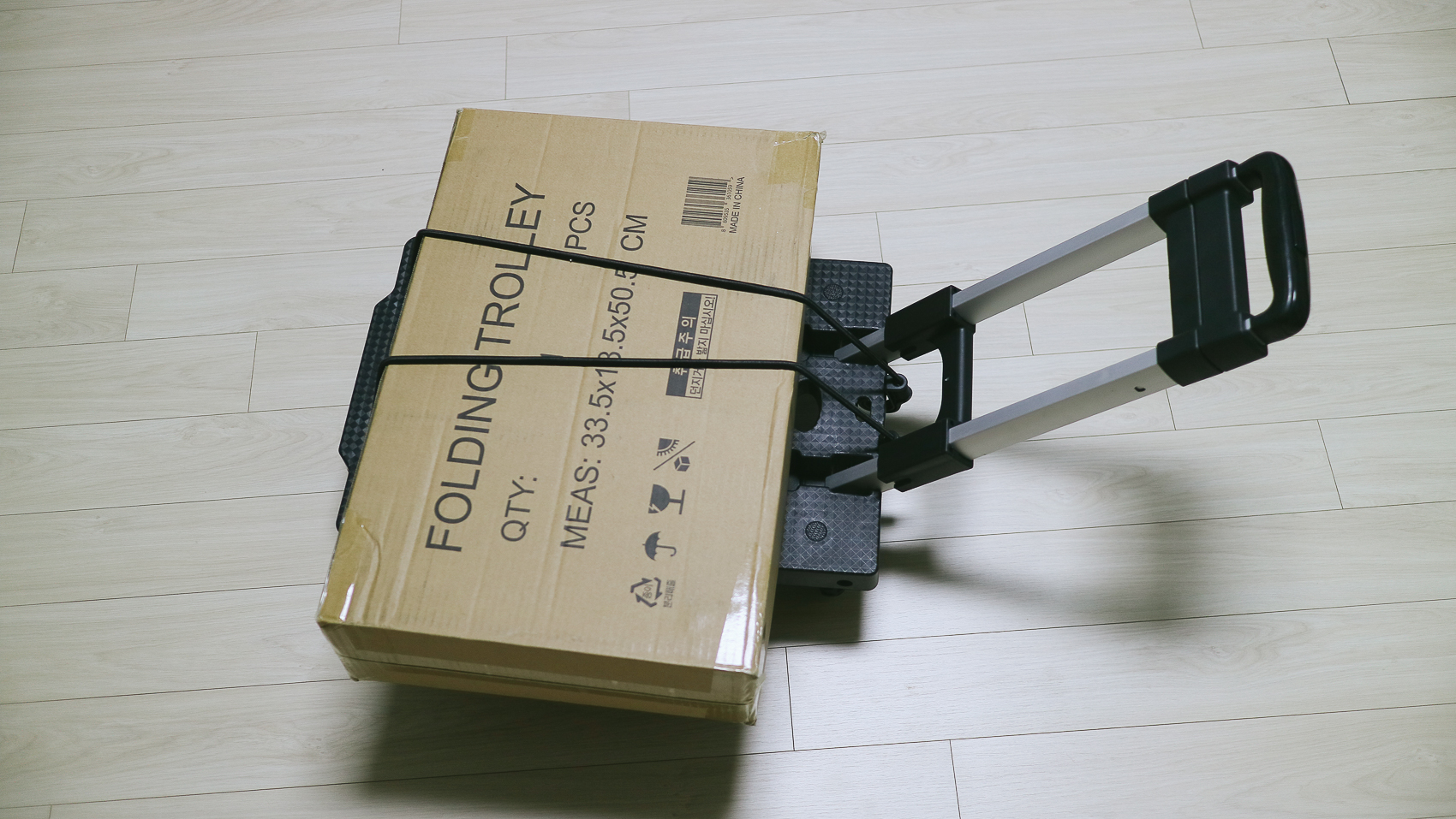 이건 그냥 테스트로 제품 택배박스를 적재한 모습이다. 익스텐션 캠핑 폴딩카트에 부착되어 있는