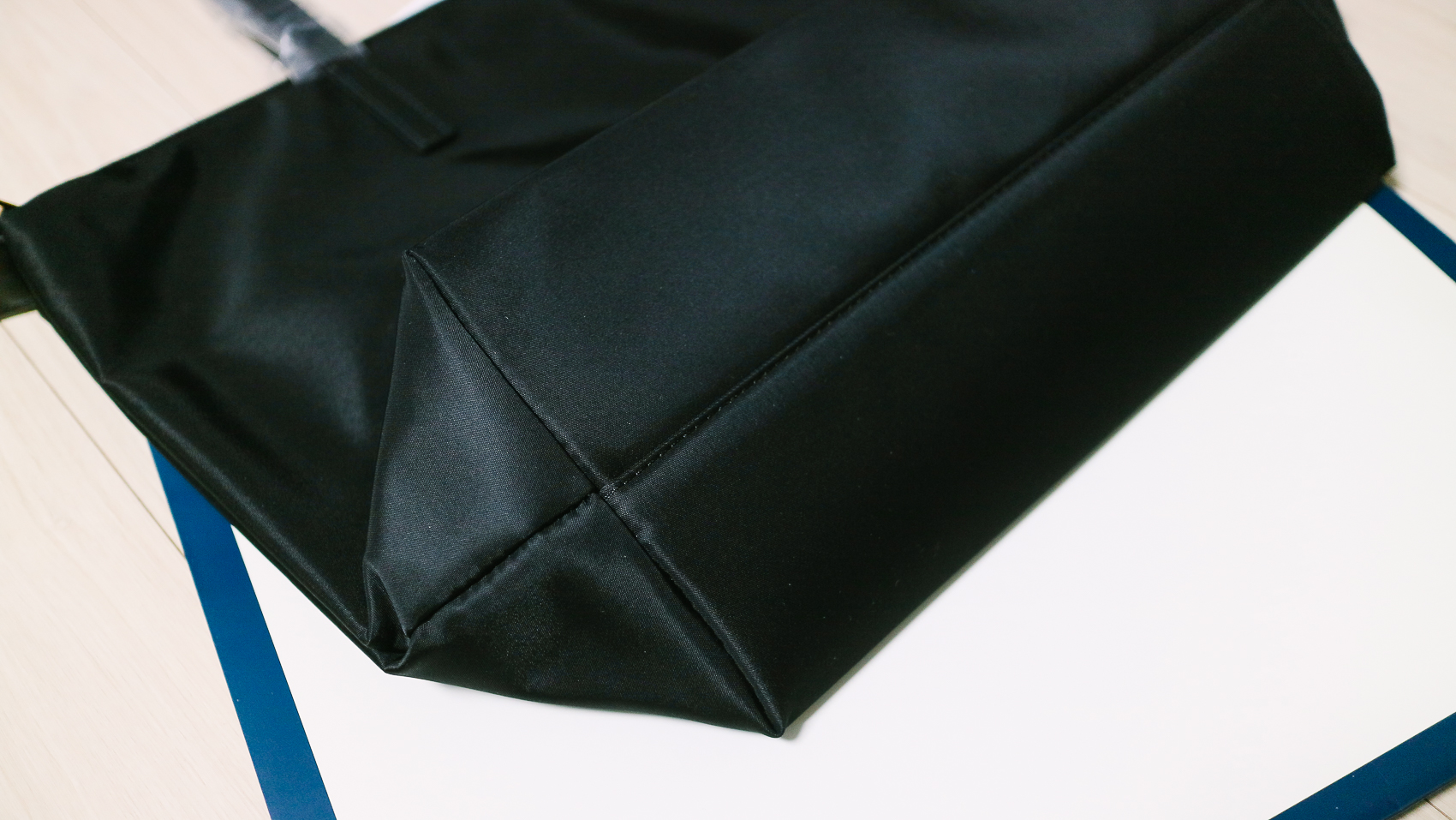 30x29X16cm(가로X세로X폭)로 적당히 여유있는 크기로 수납하기 좋은 편이다. 바닥면에 잡아주는 마감으로 헤지스 나일론 쇼퍼백의 외형을 유지시켜준다.