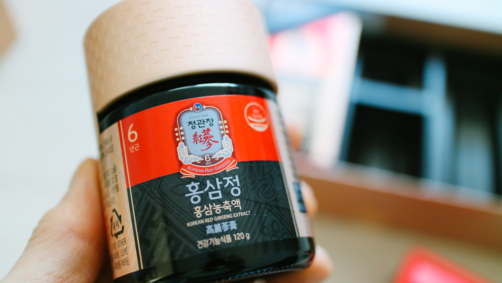 욕시 정관장의 제품 디자인은 매우 강렬하고 중후하다☺ 하루 1포 섭취로 1일 권장 섭취량(3g)이며, 홍삼농축액에 정제수만을 담은 제품이다. 외출이나 휴대가 용이하도록 스틱형 파우치로 포장되어 있다.