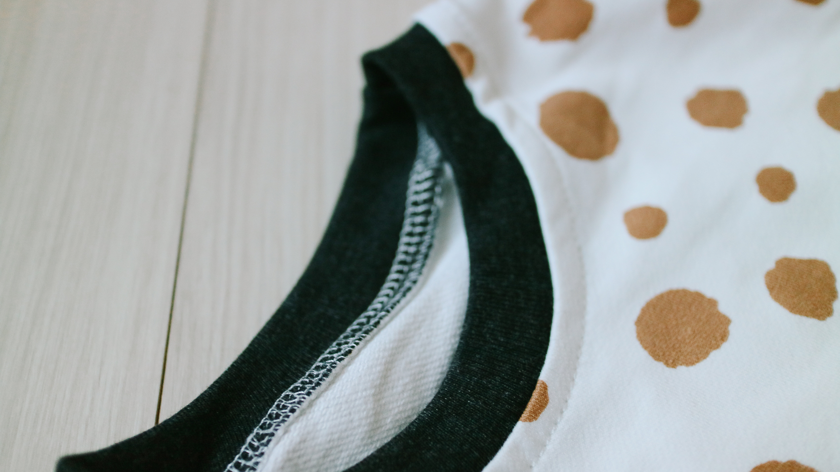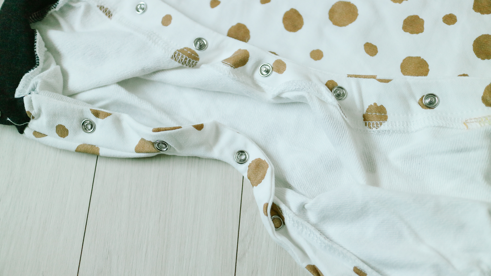 하단부에는 똑딱이가 있어 기저귀를 갈기 편하게 되어 있다. 목 라인도 라운드 넉넉하게 되어 있어 아기에게 편안한 느낌을 줄 수 있다.