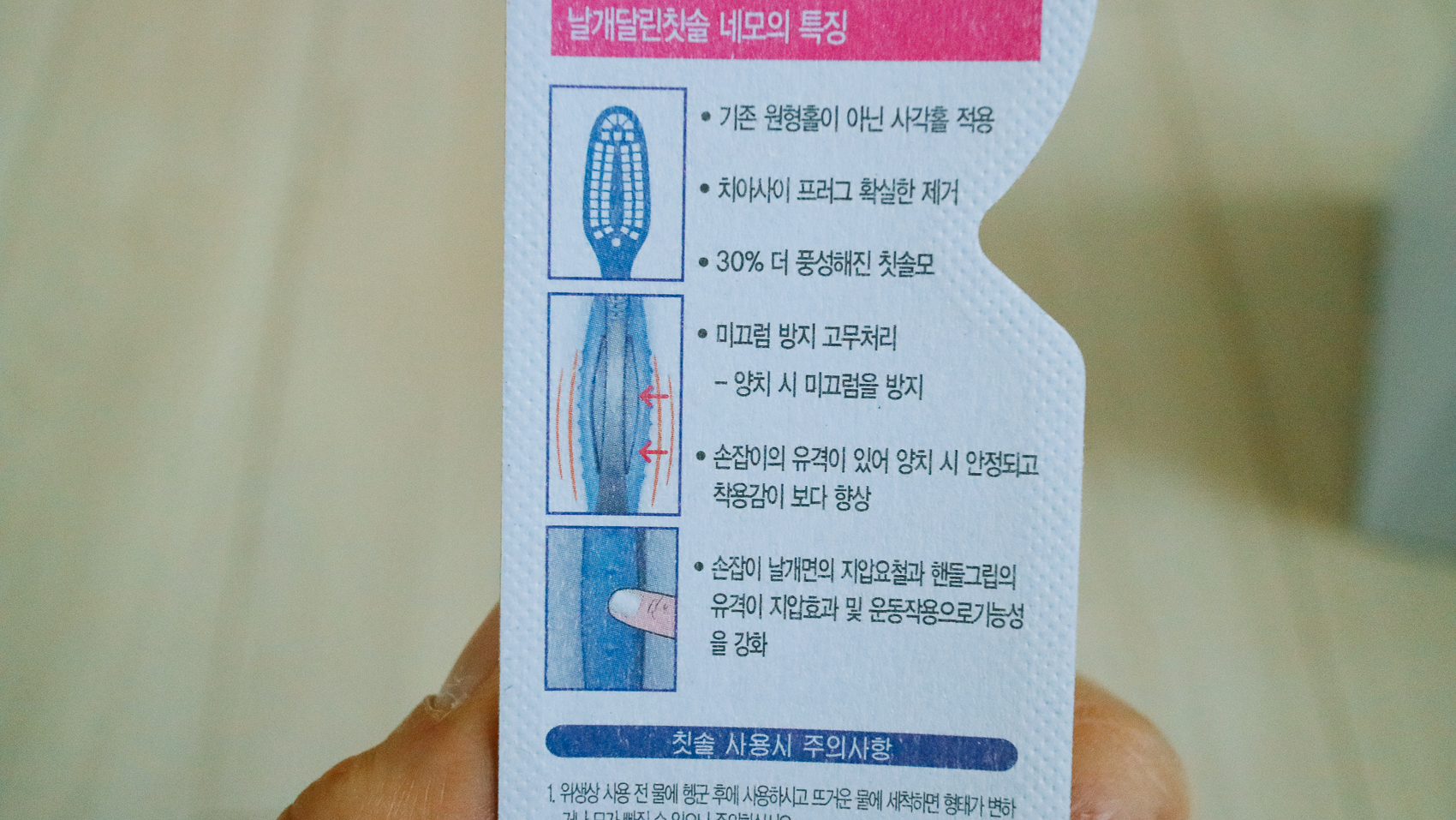 날개 달린 칫솔 네모의 특징으로는 기존 원형 홀이 아닌 사각 홀 적용으로 되었으며, 치아 사이 프러그 확실한 제거를 유도한다. 또한 30% 더 풍성해진 칫솔모와 손잡이 쪽에는 미끄럼 방지 고무처리를 하여 그립감을 더욱 살려주었다.
