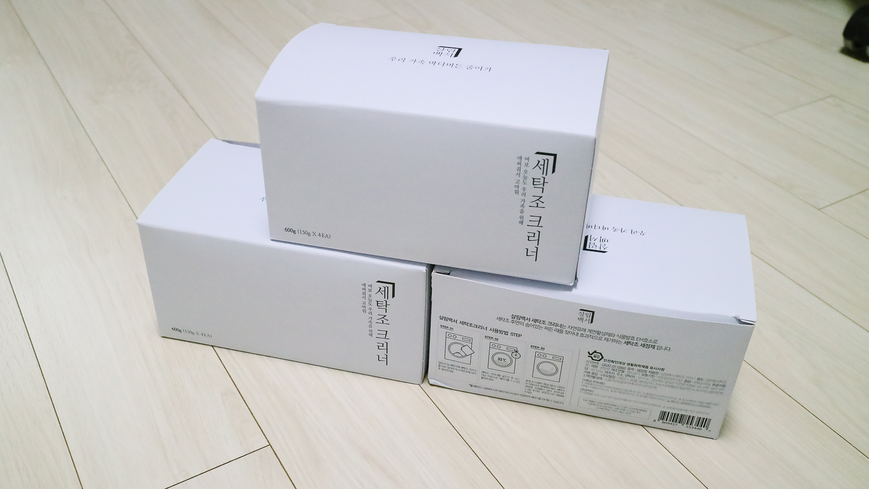 제품은 8회분을 사용할 수 있는 옵션으로 구매하였다. 제품은 통돌이, 드럼 세탁기 모두 사용할 수 있으며 EM 발효 세정은 물론 독자적인 기술력으로 세정하는 동안에도 발생할 수 있는 화학물질을 최소화시켜준다.