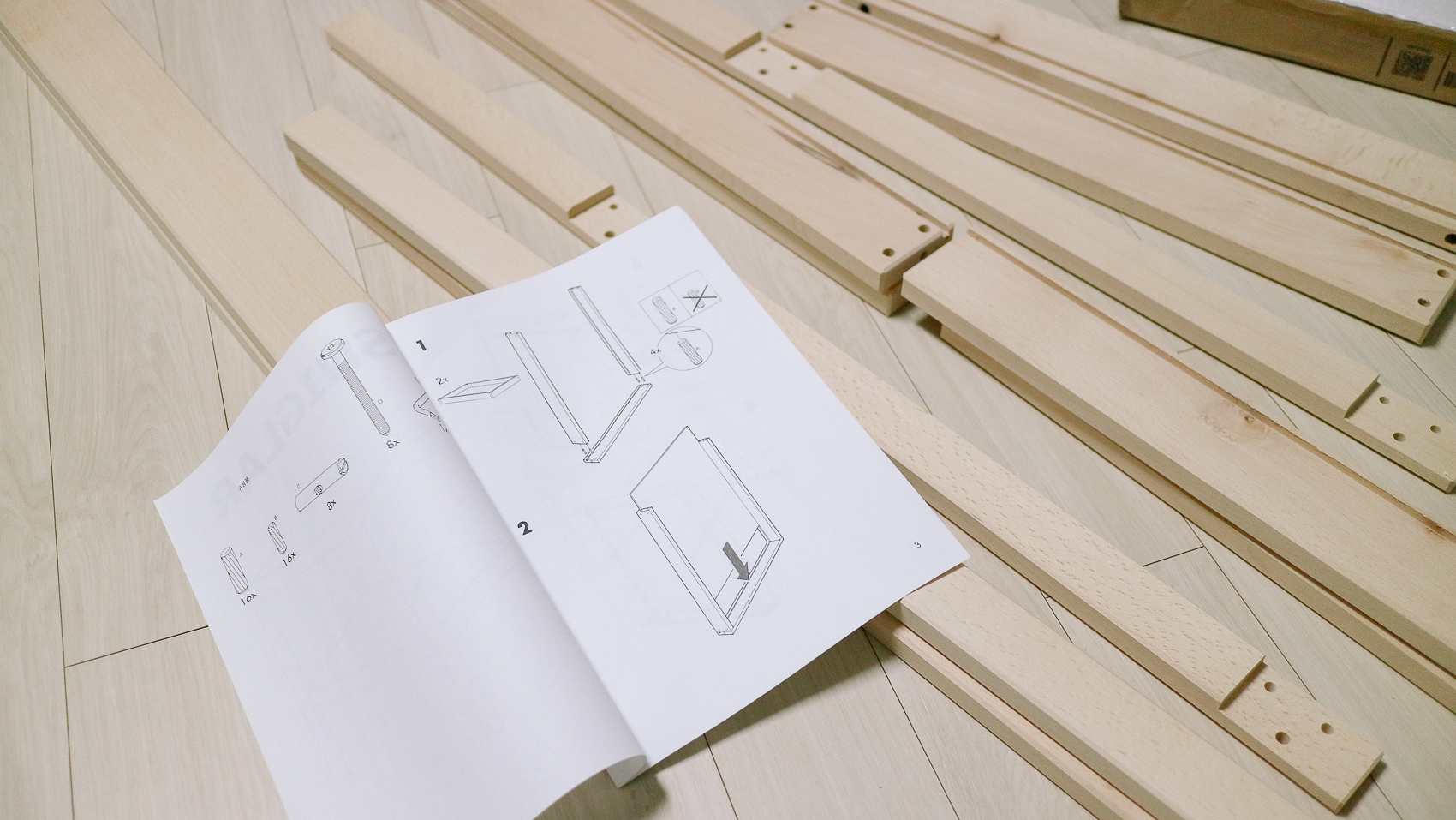 설명서대로 차근차근 조립을 시작~ 크기별로 상판을 끼울 틈새만 잘 맞추어 고정목과 볼트를 끼워주면 된다. 마지막 한쪽은 상판을 껴줘야 하기 때문에 상판을 틈새에 껴주고 체결하는 것을 잊지 말자.