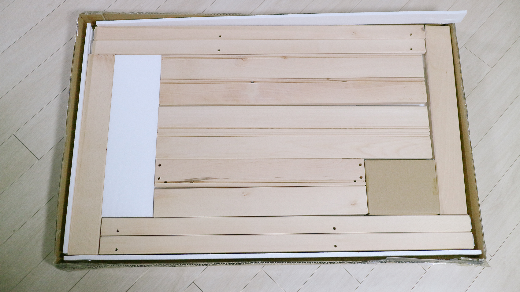 제품은 직접 조립하는 DIY 제품으로 조립 설명서와 같이 원목 자재, 볼트 등이 함께 동봉되어 배송된다. 먼저 조립 전에 순서에 알맞은 원목 자재 길이별로 구분해놓고 볼트도 세팅해 놓는다.