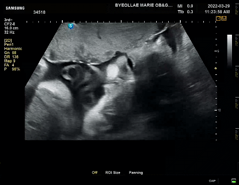 초음파 영상을 보면 까꿍이가 계속 눈을 뜨고 있는 것을 볼 수 있다. 원장샘 말로는 눈 꽤나 오랫동안 뜨고 잘 놀고 있다고 하셨다. 덕분에 장모님도 까꿍이의 모습에 더욱더 생동감을 느끼고 교감하였다고 했다.