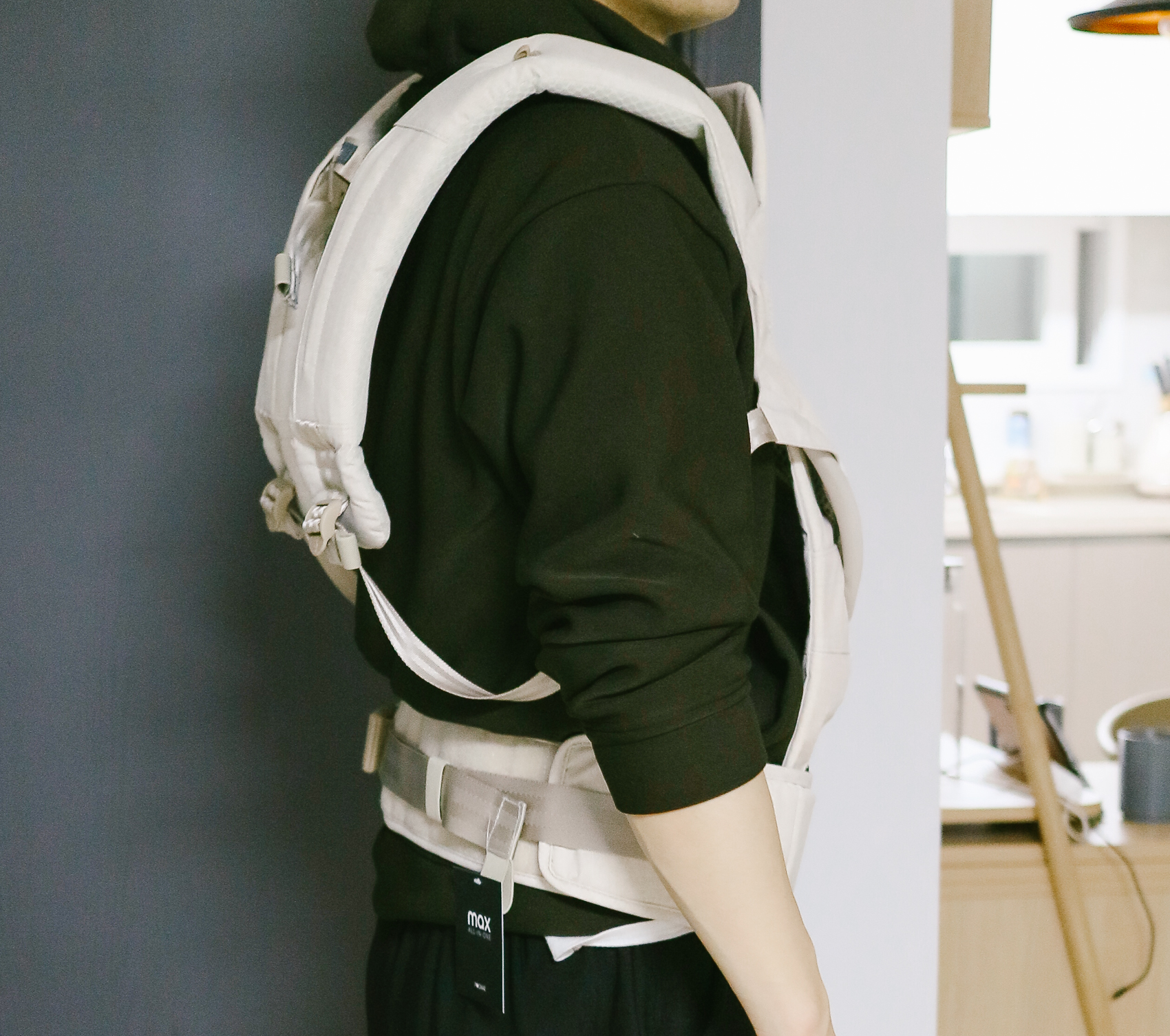 일단 한번 착용해보았다. 아직 까꿍이가 없이 착용한 것이라 어느정도로 조정해야 할지 감이 안 잡히지만 대략적인 느낌을 보여주기 위해 촬영 보았다. 확실히 안전감 있고 견고하게 되어 있는 아기띠라는 느낌을 받았다.