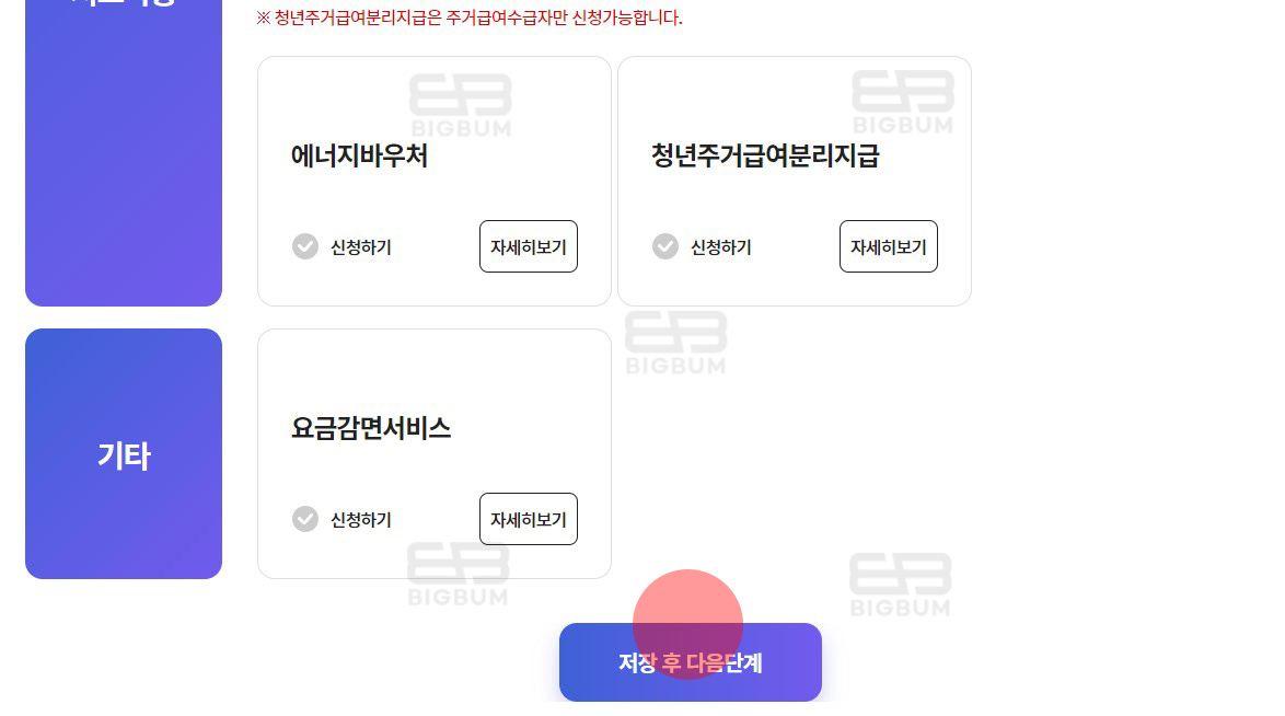 ② 복지급여 서비스 리스트가 출력되는데, 상단에 위치한 임신출산 영역의 '산모신생아 건강관리' 신청하기를 체크 후 하단의 '저장 후 다음 단계'를 클릭한다.