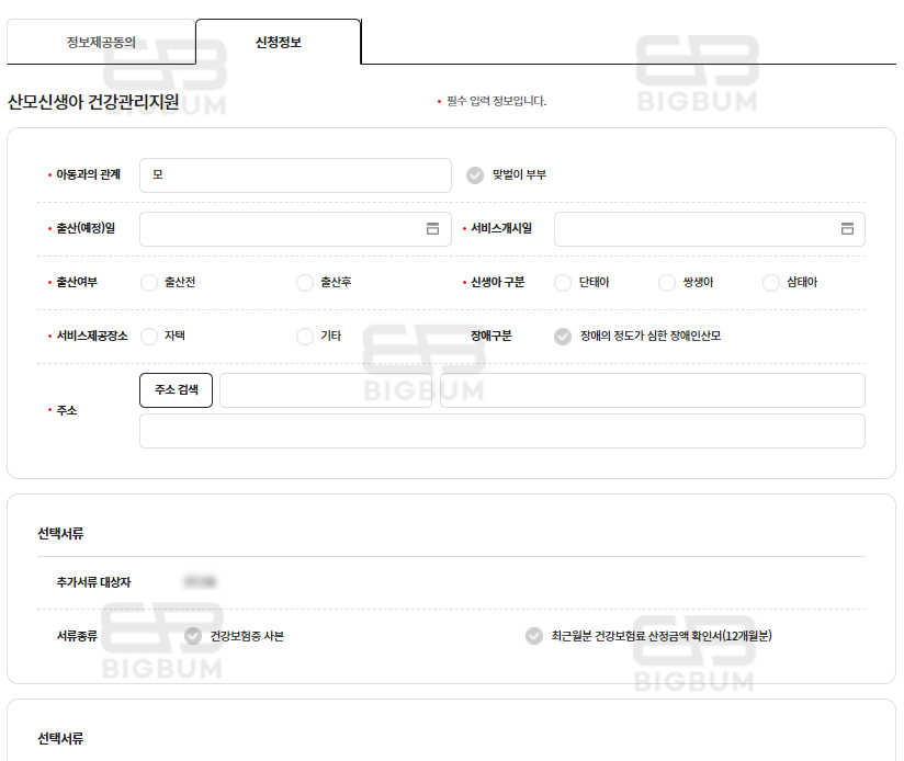 하단의 선택서류란은 필수는 아니며, 바우처 카드란 정보도 이미 발급된 상태라면 기재하지 말아야 한다. 만약 미신청 상태라면 서비스와 함께 바우처 카드 신청이 가능하다.