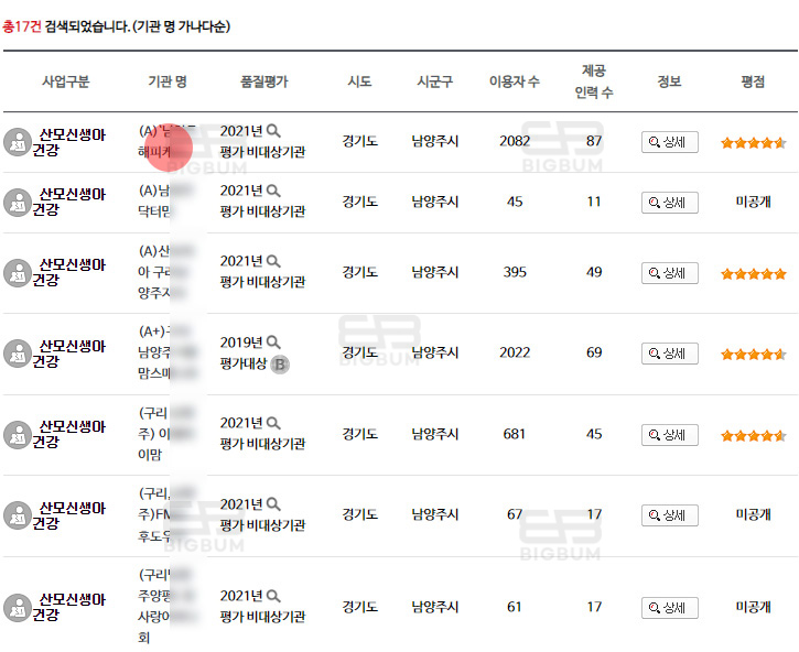 ④ 조회시 하단에 산후도우미 업체가 리스트업 된다. 해당 업체의 이용자 수, 제공 인력수, 정보, 평점으로 간략히 표시가 되어 있는데, 업체명을 클릭하면 보다 자세한 업체 정보 조회가 가능하다.