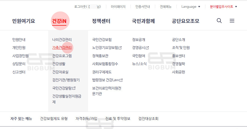 ① 하단의 링크 혹은 포털에 '국민건강보험공단' 을 검색하여 접속 및 로그인을 한다. 메뉴 건강 in → 가족건강관리 클릭한다.