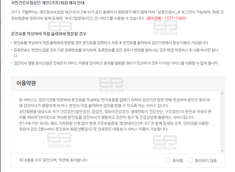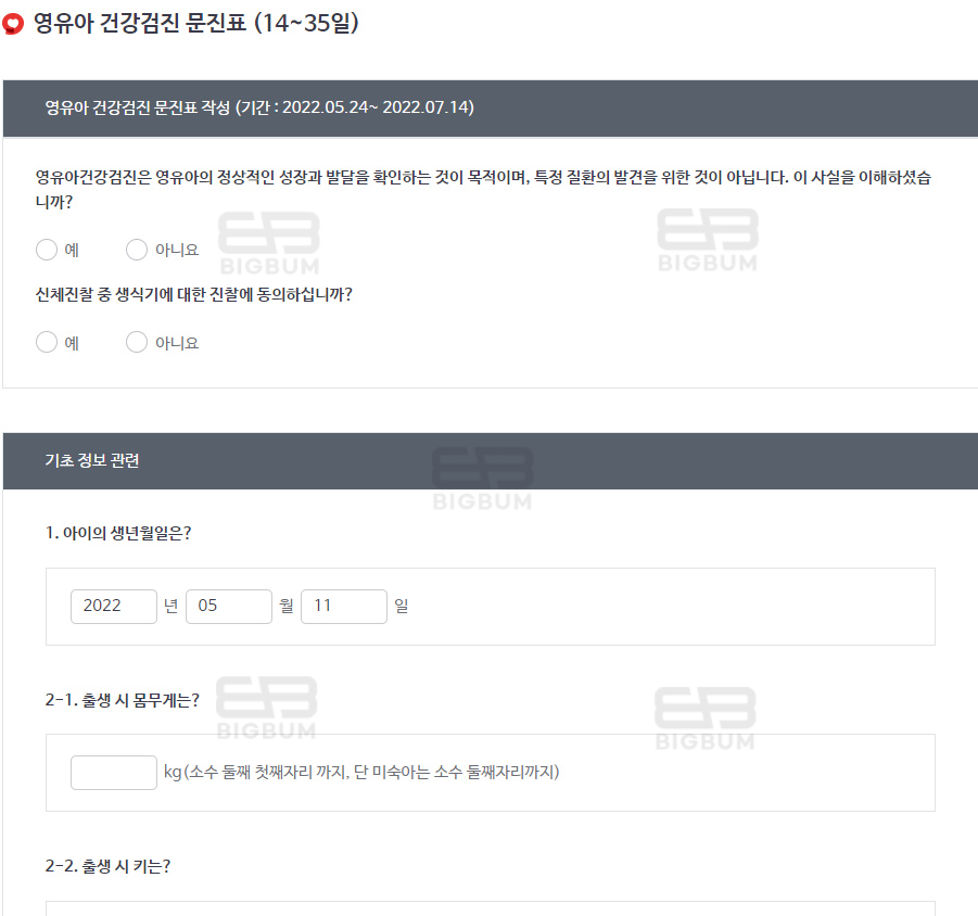 ④ 이용약관 동의 및 영유아 건강검진 문진표에 대한 항목의 질문에 체크를 하여 작성을 시작한다.