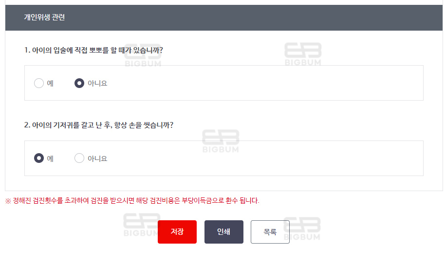 ⑤ 문진표 항목을 작성하며 스크롤을 내려가다 보면 하단의 저장 버튼이 보이게 되는데 작성 완료 후 저장 버튼을 클릭하여 문진표 작성을 완료한다.