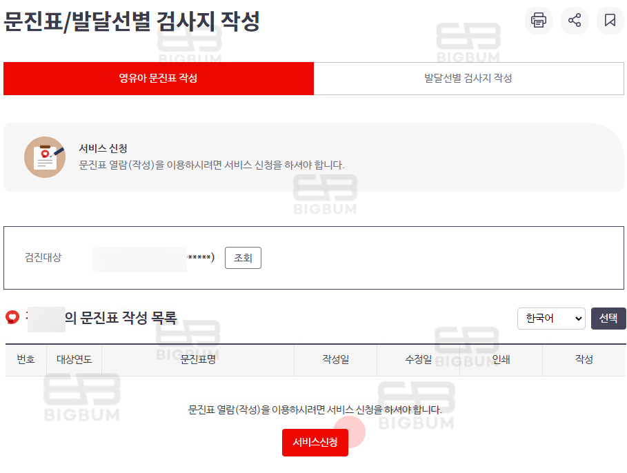 ③문진표/발달 선별 검사지 작성이 뜨는데 검진대상의 조회 버튼을 클릭 후 생성되는 서비스 신청 버튼을 클릭한다.