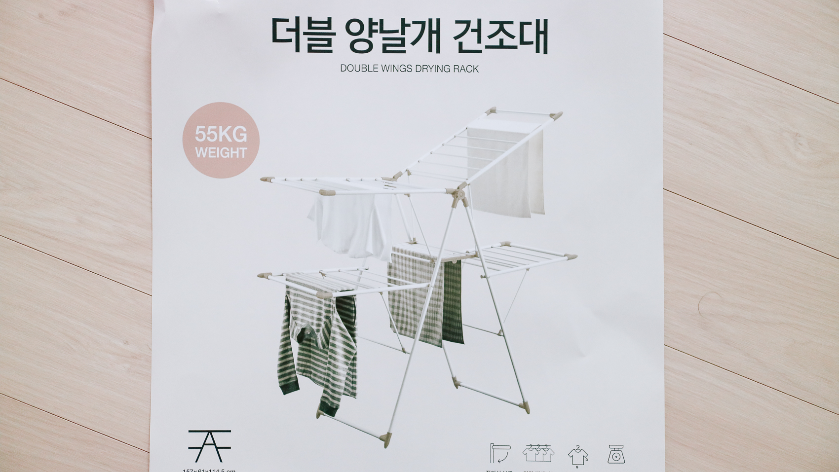 제품 사양으로는 1570x610x1150mm 사이즈이며 재질은 카본스틸(파우더코팅), 폴리프로필렌으로 되어 있다. 흰색 페인트 벗겨짐 없이 잘 사용하고 있다. 단순한 빨래 건조대이지만 화이트 톤으로 다양한 공간에 배치해도 깔끔함이 돋보이는 건조대이다.