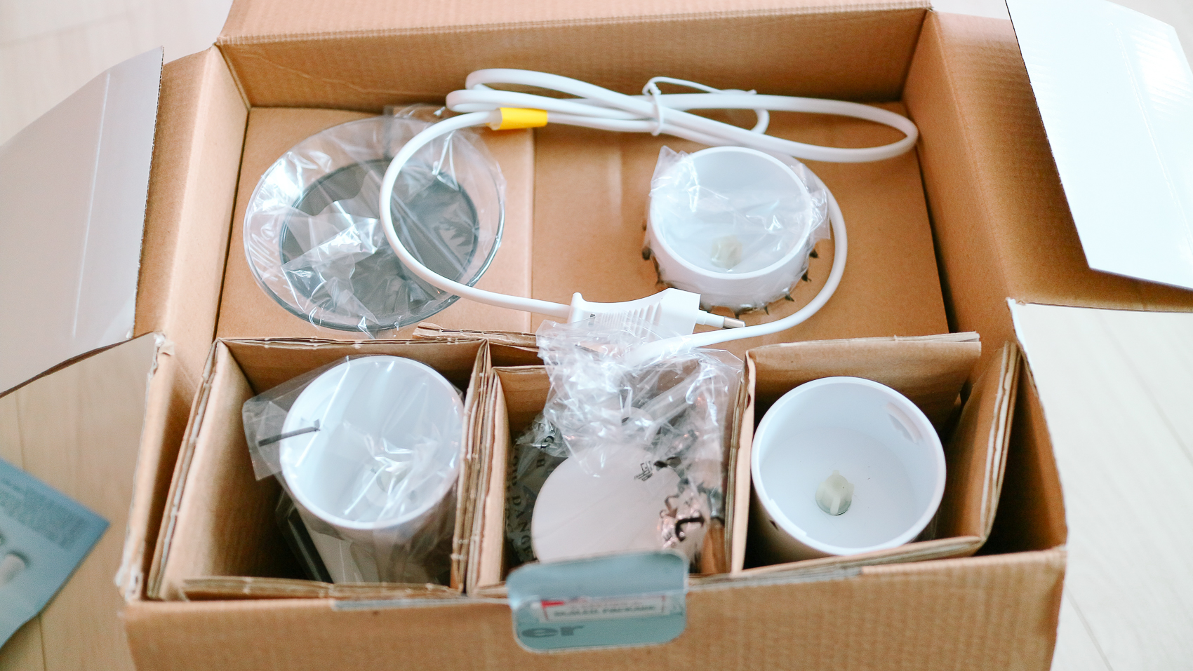 꼼꼼한 포장에 제품의 하자 없이 안전하게 배송되었다. 제품 구성품은 본체, 스테인레스 칼날봉, 거품기, 다지기, 700ml 믹싱 컵, 믹서 벽걸이 거치대로 이루어져 있다.