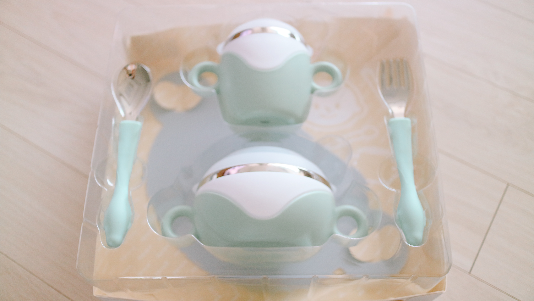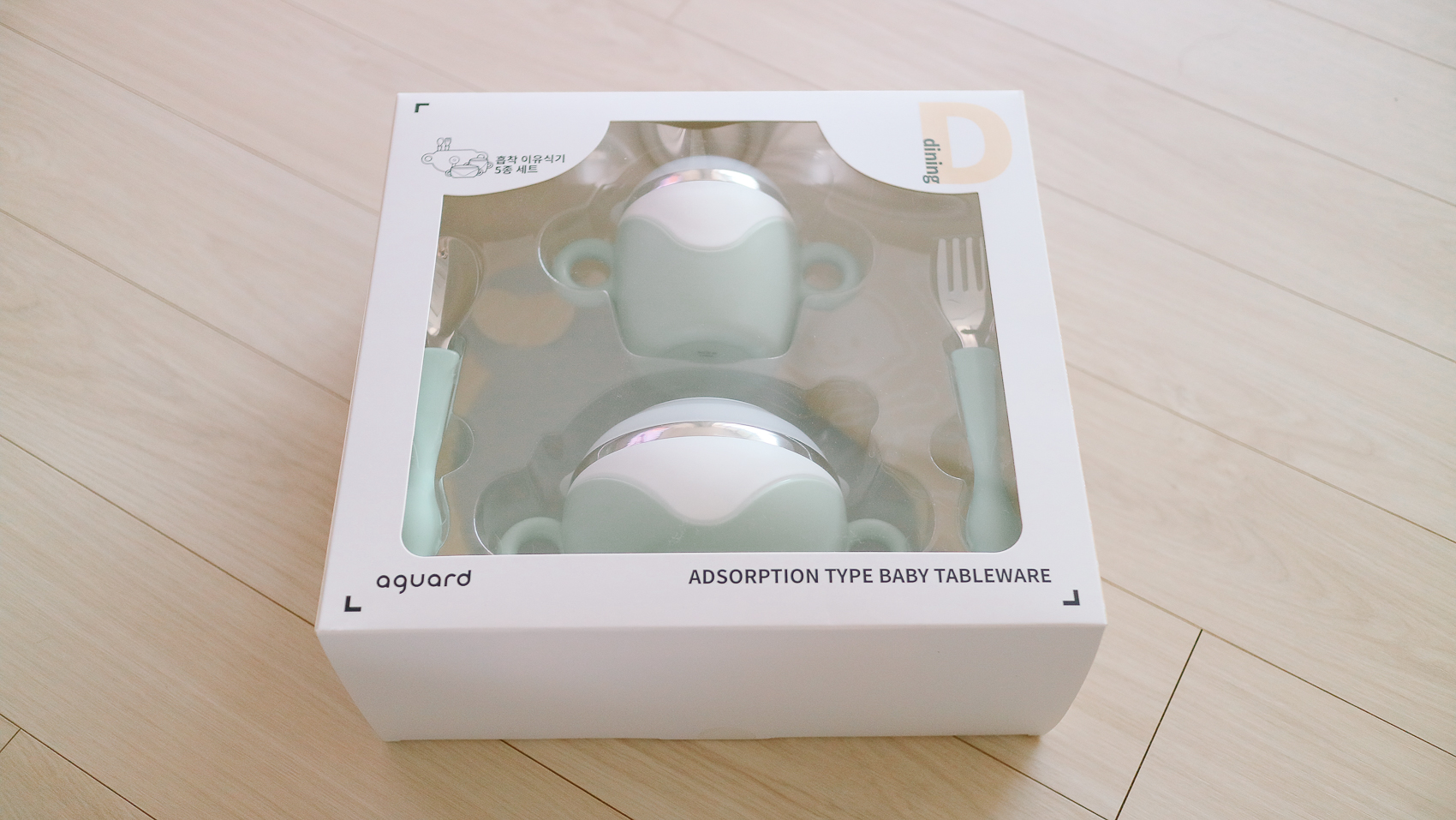 제품 구성품은 흡착판, 보울, 컵, 스푼, 포크이며, 용량은 용기 350ml, 컵 250ml로 구성되어 있다.
