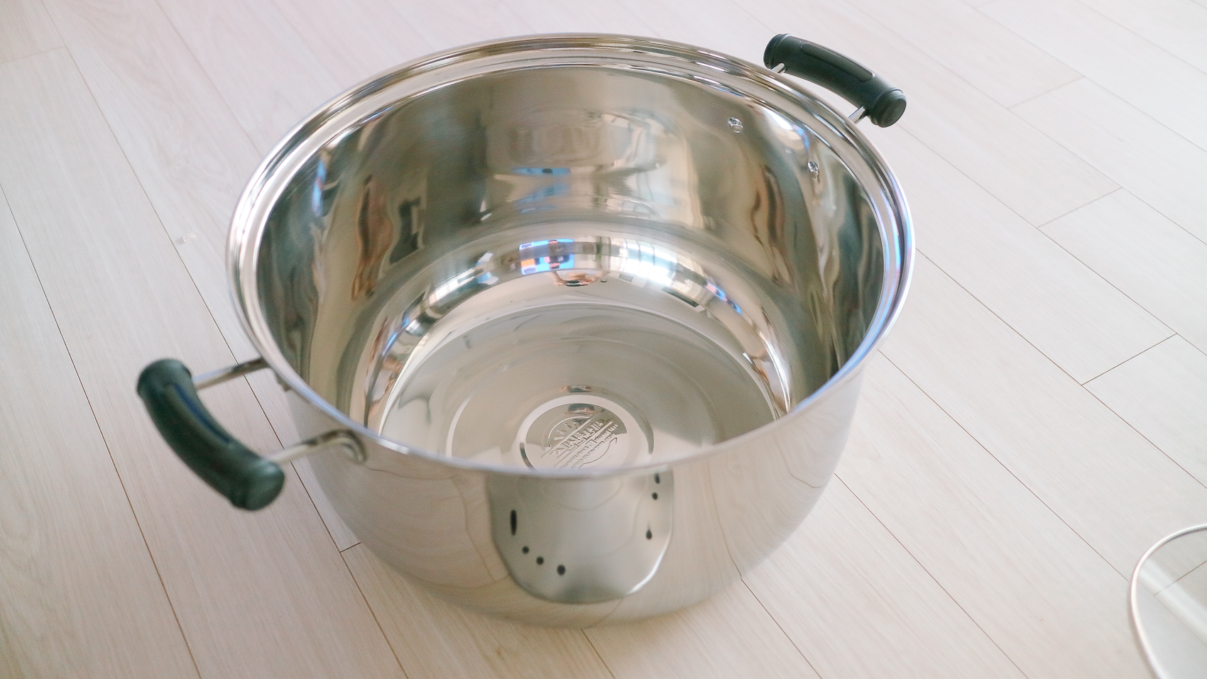 중간층에 물이 차있는 2중 구조의 바닥이라 빨래가 절대로 타거나 눌지 않아 안전하게 삶을 수 있다. 제품을 수령후 스테인리스 연마제를 제거하기 위해 식용유를 활용하여 닦아준다. 본래 식초와 베이킹 소다를 활용하여 추가적으로 세척을 해야 하는데 일단 식용유를 활용하여 연마제를 제거한 모습이다.