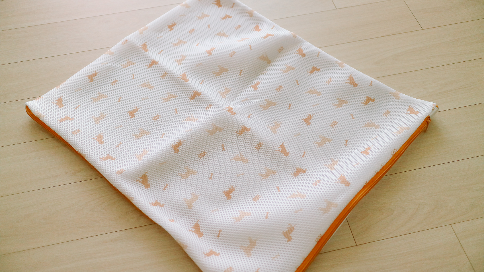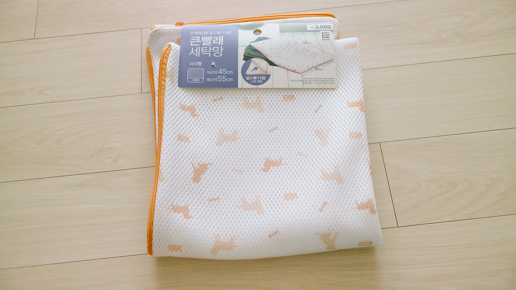 그래도 아이용 빨래 세탁망이라고 나름 귀여운 강아지 패턴이 거려진 세탁망을 선택하였다. 제품은 가로 45x55cm로 꽤나 큰 사이즈이다. 그리고 망 질감 자체가 두께감이 있어 폭신하고 굉장히 마감도 좋았다.