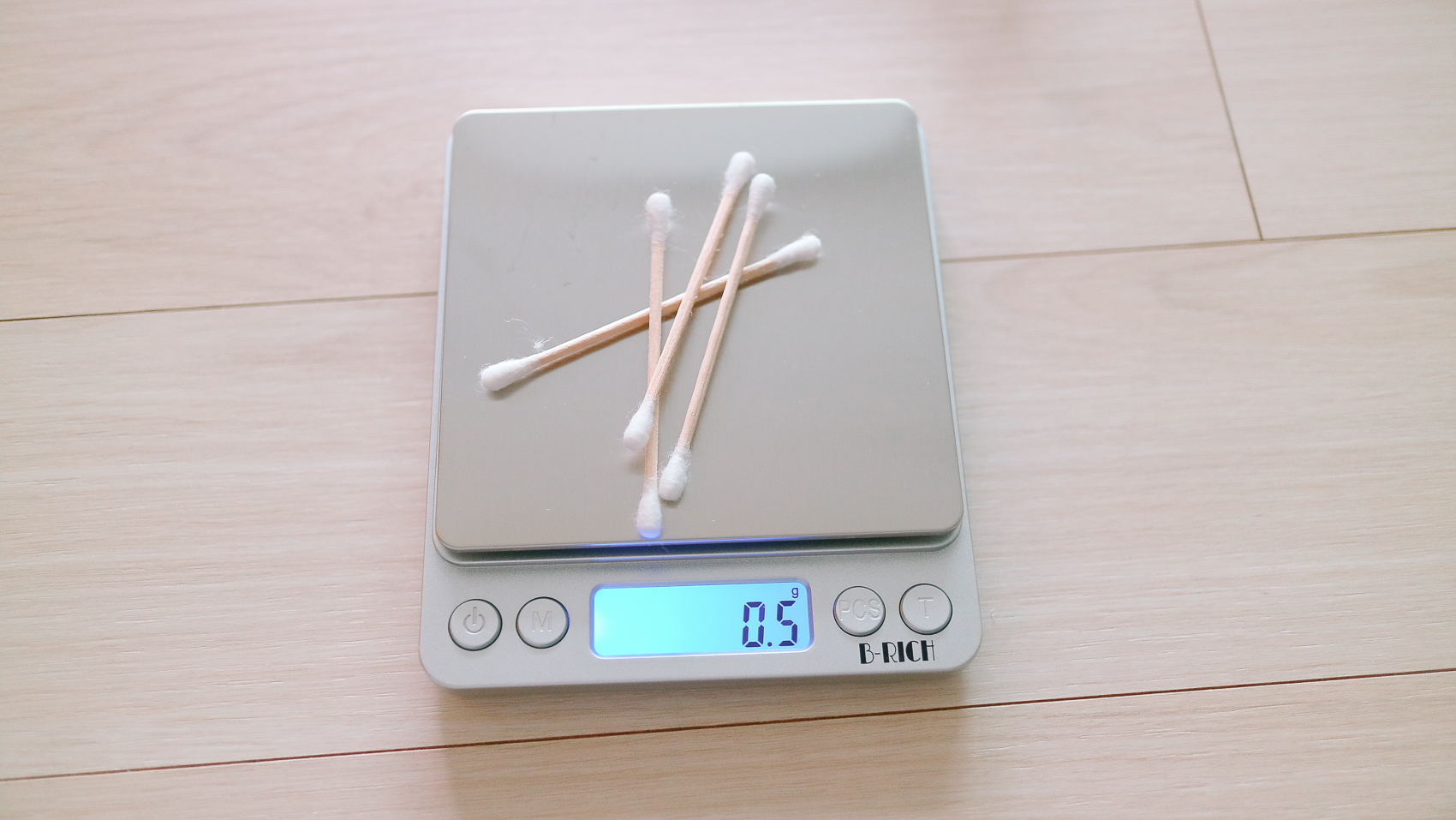 몇 개의 면봉을 올렸을 때 측정되는 수치. 단위도 무게(g) 부피(ml) 변환이 가능하여 용도에 맞게 사용할 수 있다. 이유식과 섬세한 저울을 측정할 때 정말 필요한 가정용 정밀 전자저울이다!