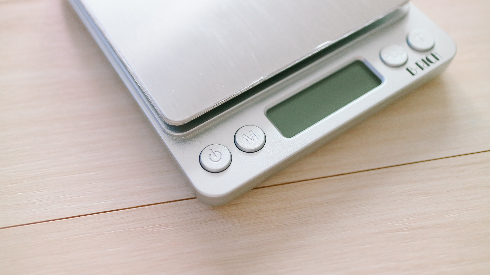 기본적으로 전원버튼, 단위변환, PCS 기능, T(TARE) 4개의 버튼이 있으며 T키 같은 경우는 용기를 먼저 올려놓고 T를 눌러주면 용기의 중량이 0으로 잡혀 용기의 무게를 제외한 순수 재료의 무게만을 측정할 수 있다.