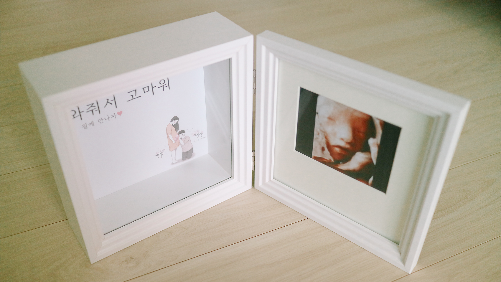 우리 아기의 첫 순간을 위해서 구매한 임테기 보관함 액자 프레임! 구매한지는 출산 전으로 처음 받았던 3D 초음파 사진과 아들의 탯줄을 보관하고 있다.