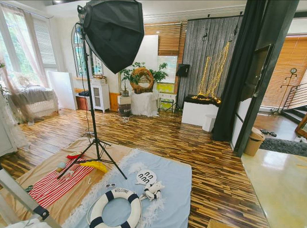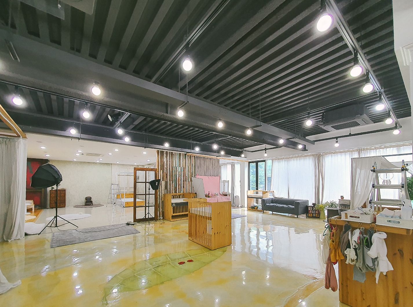 이곳이 2층 촬영 세트에 전경 모습이다. 탁 트인 공간에서 각 동선에 맞게 촬영을 진행하였다. 다행히 아들은 한 번도 울지 않고 오히려 카메라가 신기했는지 집중을 하는 모습에 15분 만에 촬영을 종료하는 대기록을 세웠다.