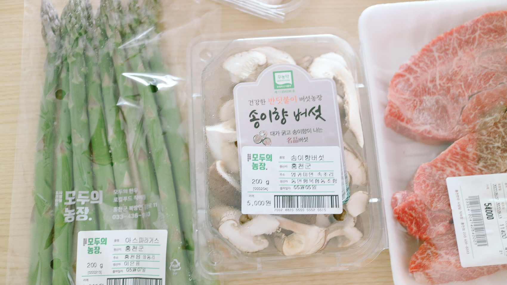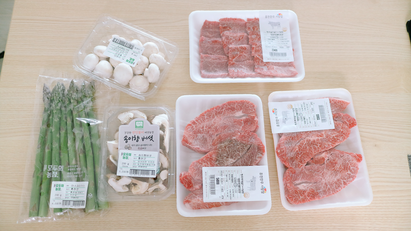구성은 부채살 2개와 설깃살 1개, 그리고 송이향 버섯, 아스파라거스, 양송이가 있었다. ㅎㅎ 아스파라거스 너무 좋아하는데 신난다 :)