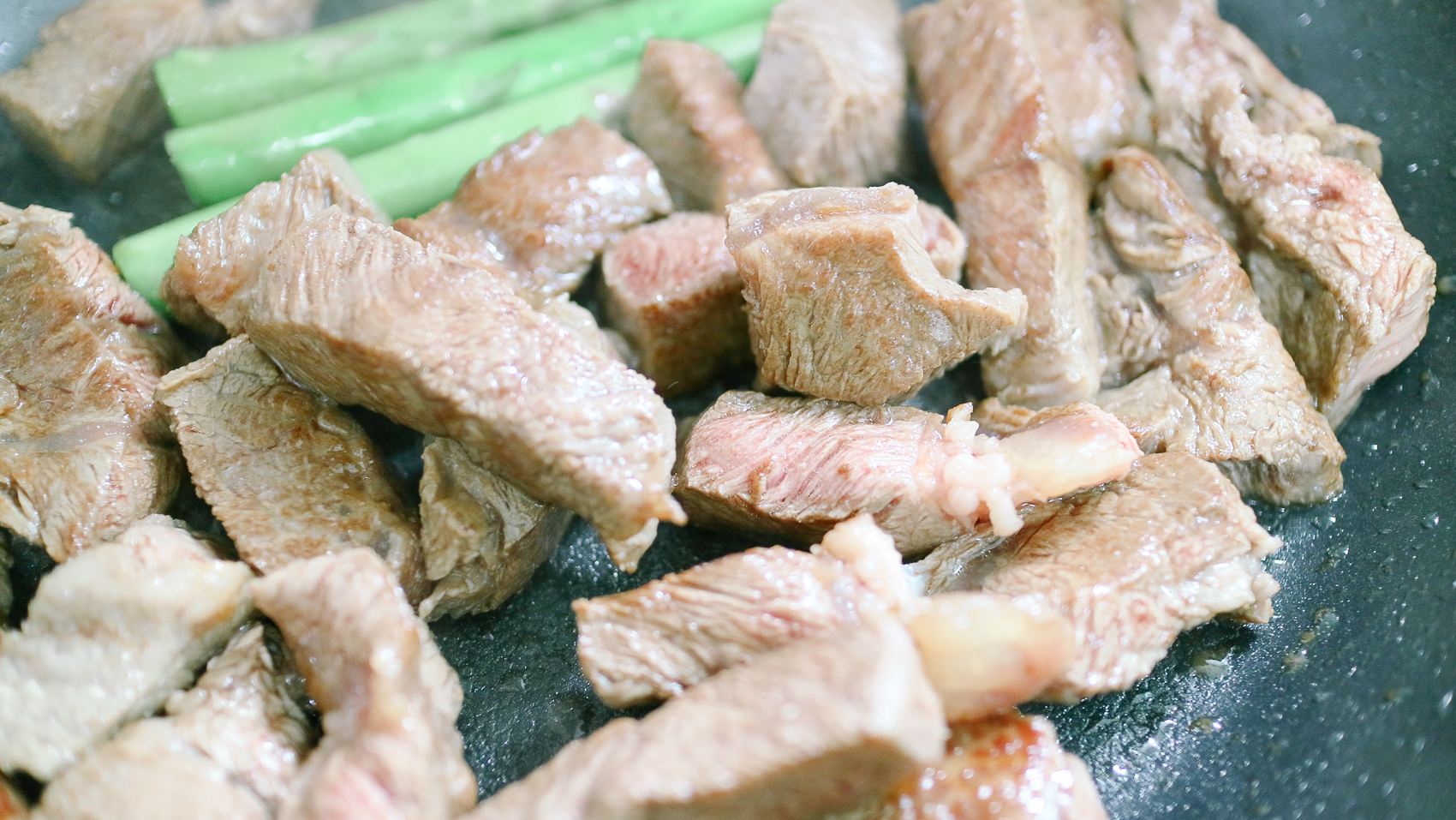 아스파라거스도 함께 송송 잘라서 투하! 크 보기만 해도 군침이 돈다. 너무 핏기가 있는 건 싫어하기 때문에 적당히 핏기가 사라지고 익어갈 무렵 고기를 덜어내서 먹을 준비를 한다.