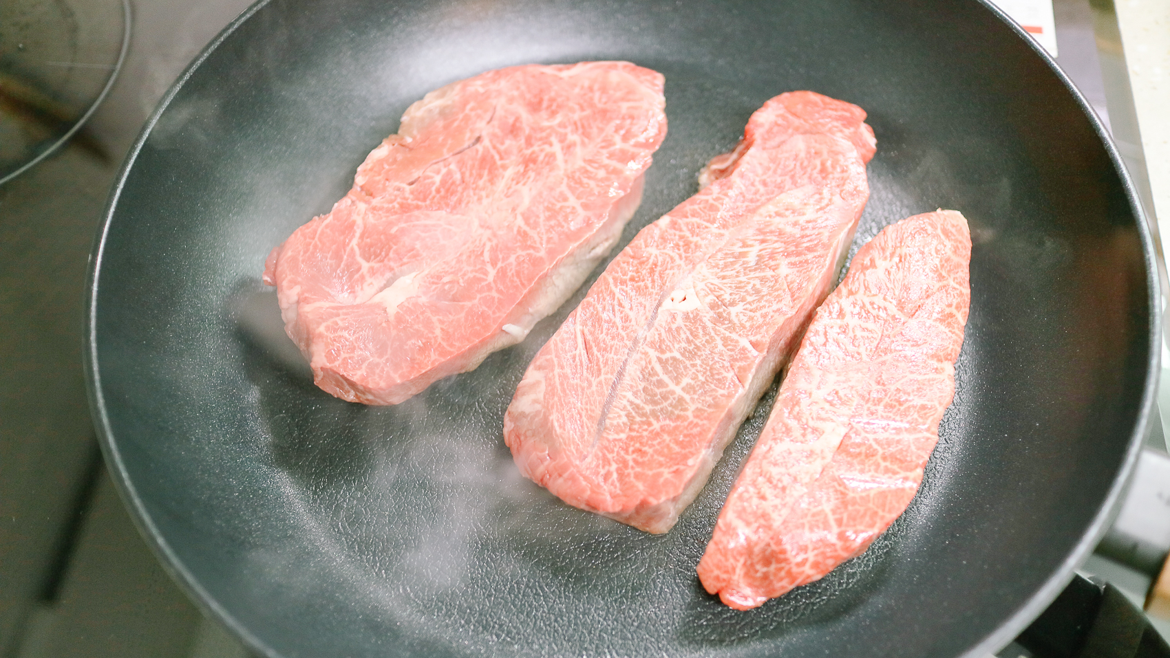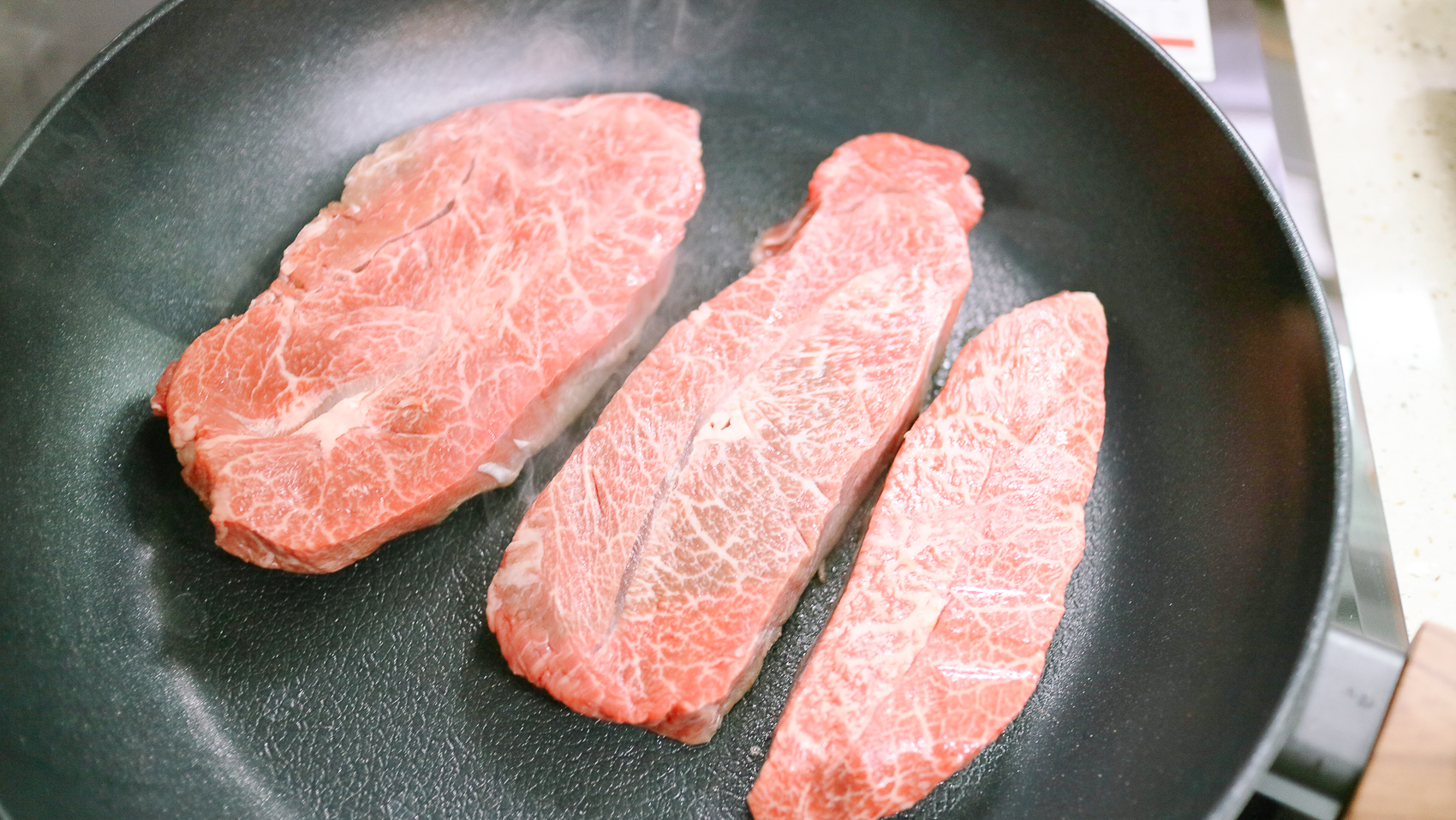 최대한 부드러운 식감을 느낄 수 있도록 적당한 열에서 천천히 굽기 시작. 바닥면이 익으면 뒤집어서 서서히 차근차근 익혀갔다.